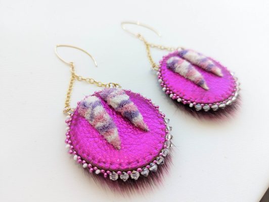 $239.00 | An elevation of the walrus tusk design traditionally seen on Inuit parkas, these earrings combine traditional with contemporary art techniques including laser cut, tufting, beading, and sealskin. Lightweight, stunning pieces and original wearable art for a special occasion or make a bold statement for everyday use. | |