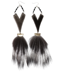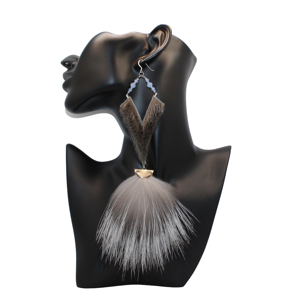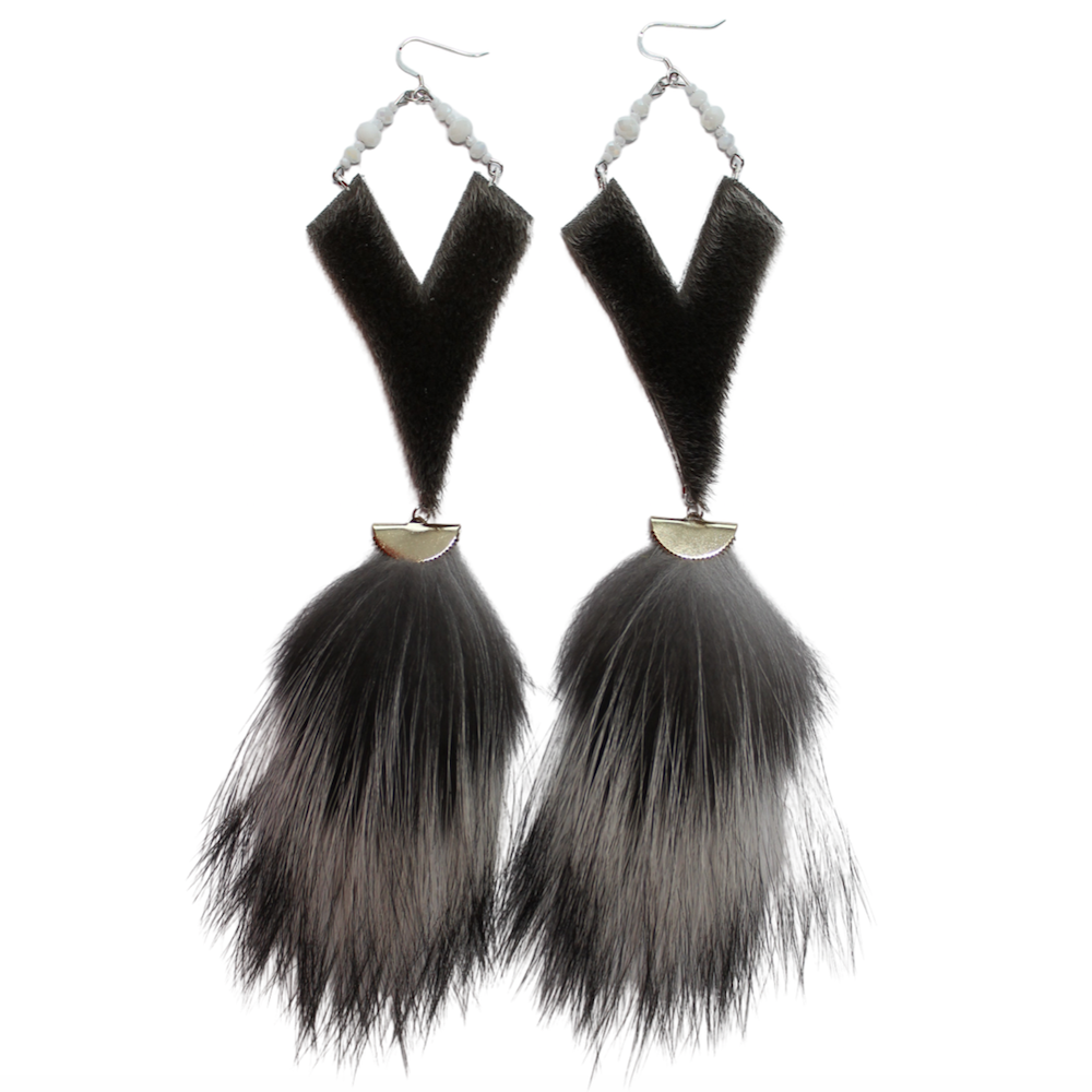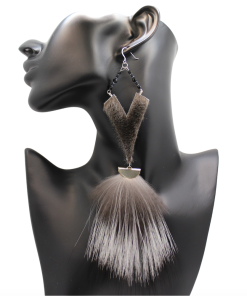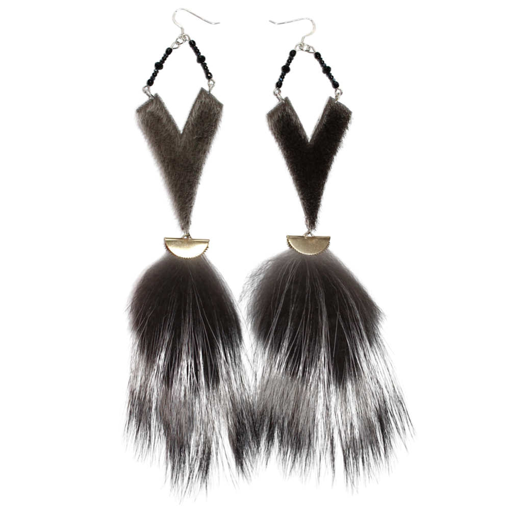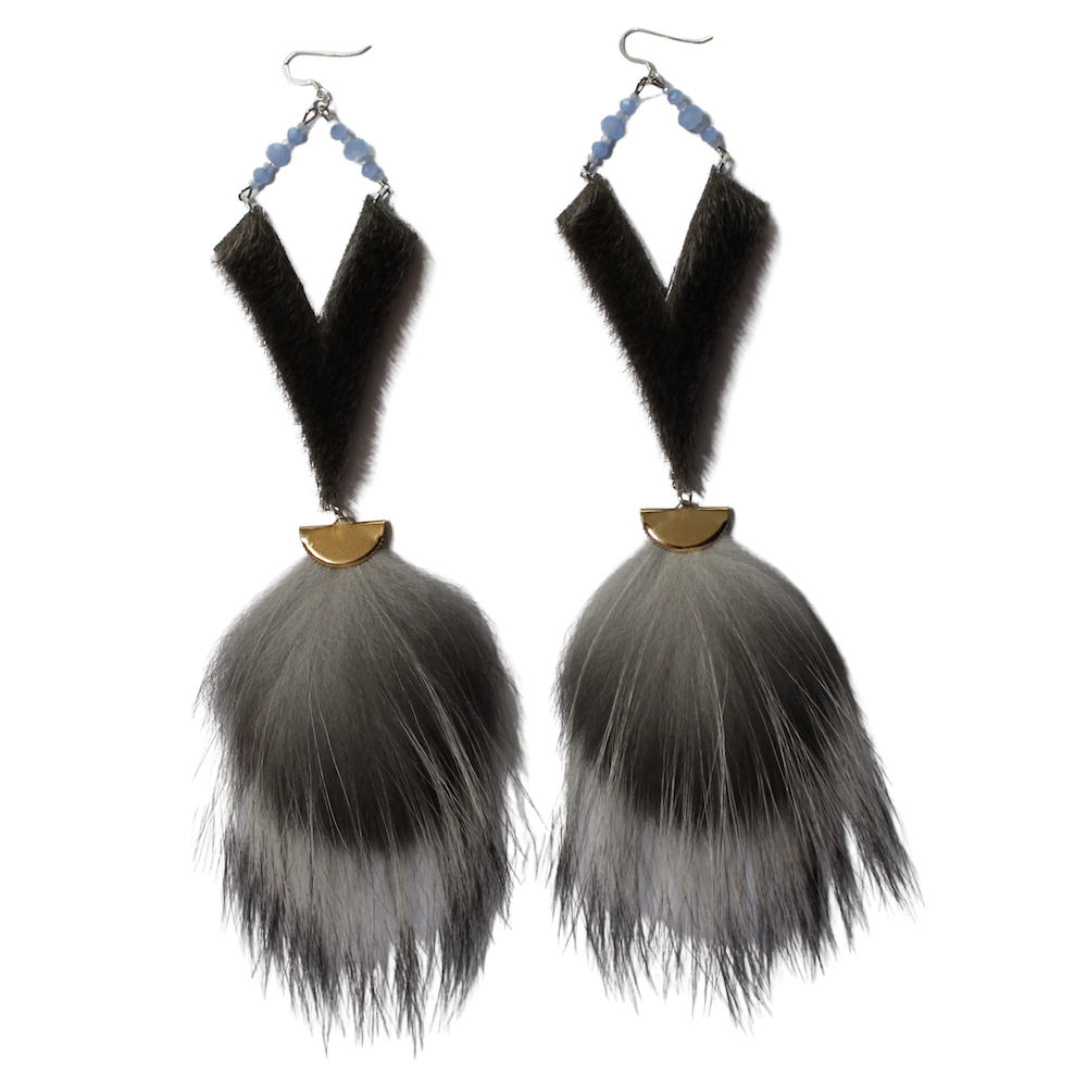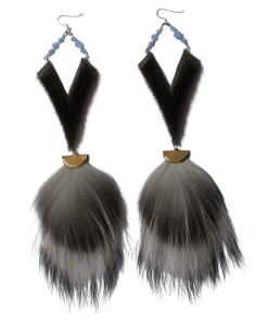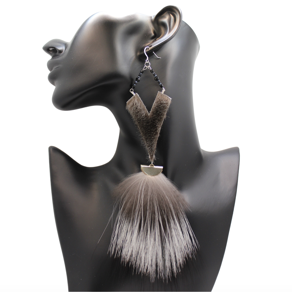 Natural Grey Sealskin, Silver fox fur, rondelle beads, grey moosehide backing, Stirling Silver hooks.