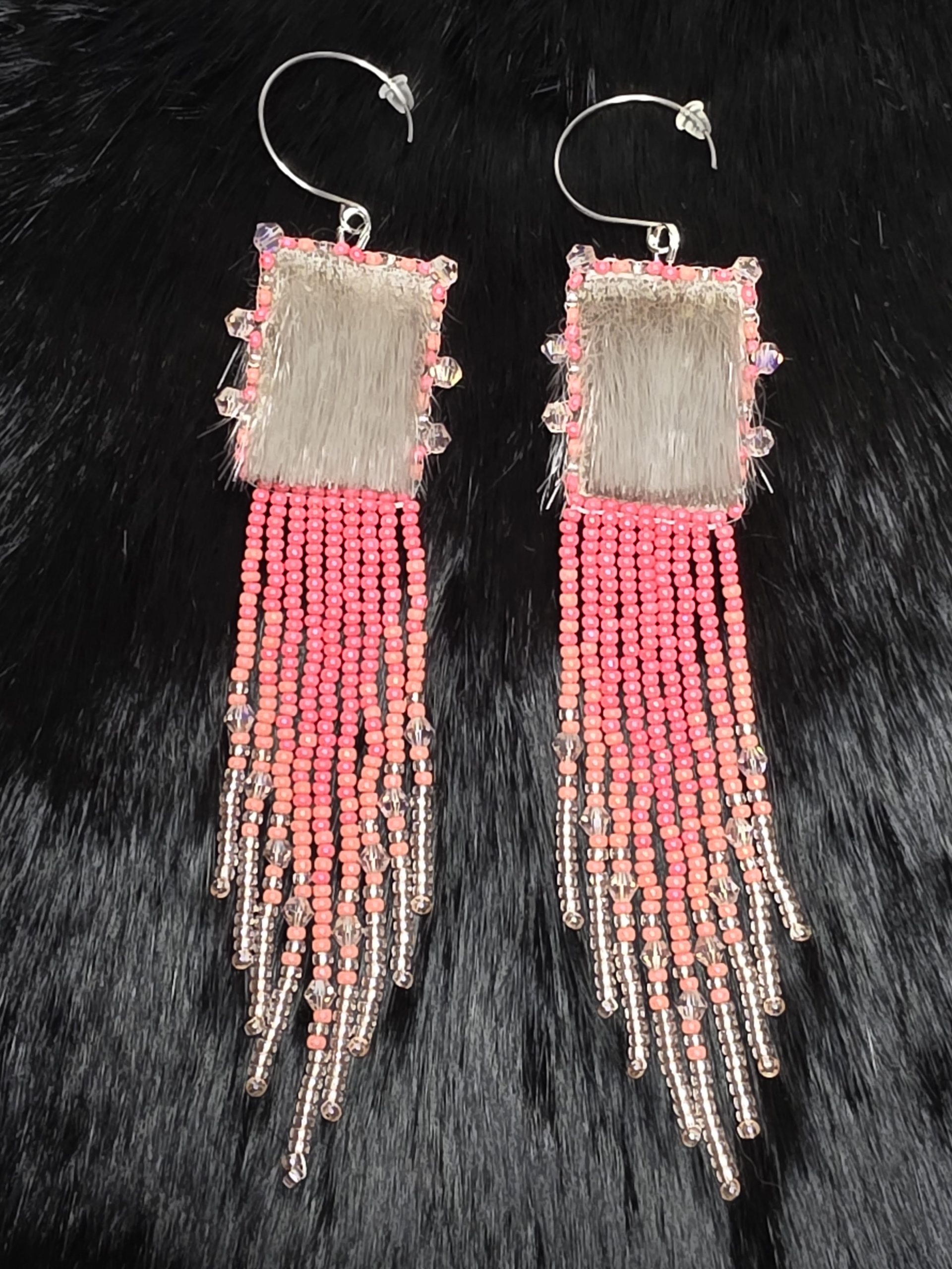 Ethically sourced seal skin, double sided, size 11/0 pink salmon, pale salmon and light pink Czech seed beads. Size 3/0 light pink bicones with round silver filled hooks.