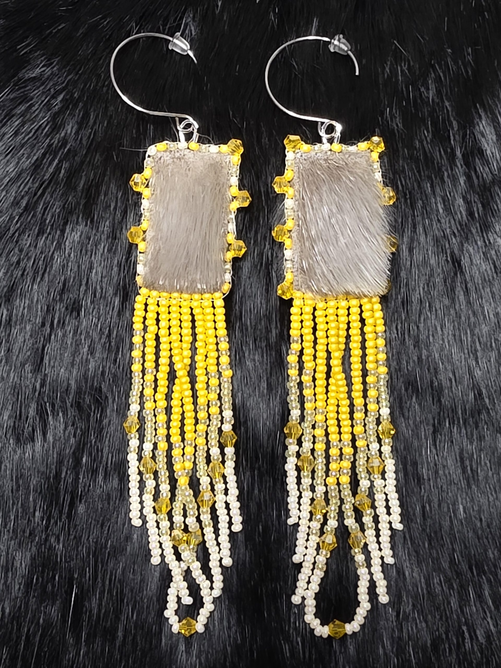 Ethically sourced seal skin, double sided, size 11/0 bright yellow, pale yellow and pale beige Czech seed beads. Size 3/0 light yellow bicones with round silver filled hooks.