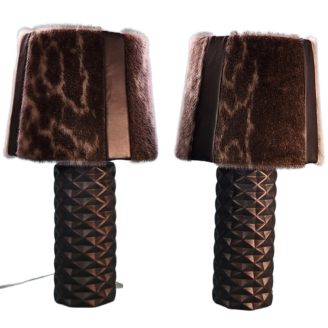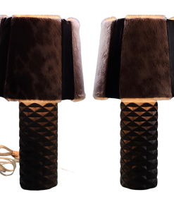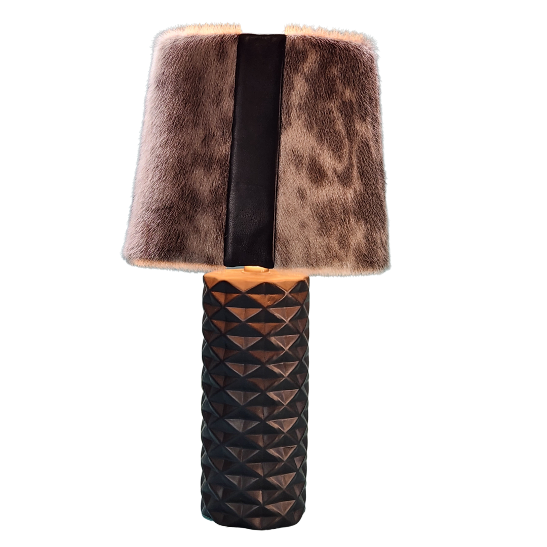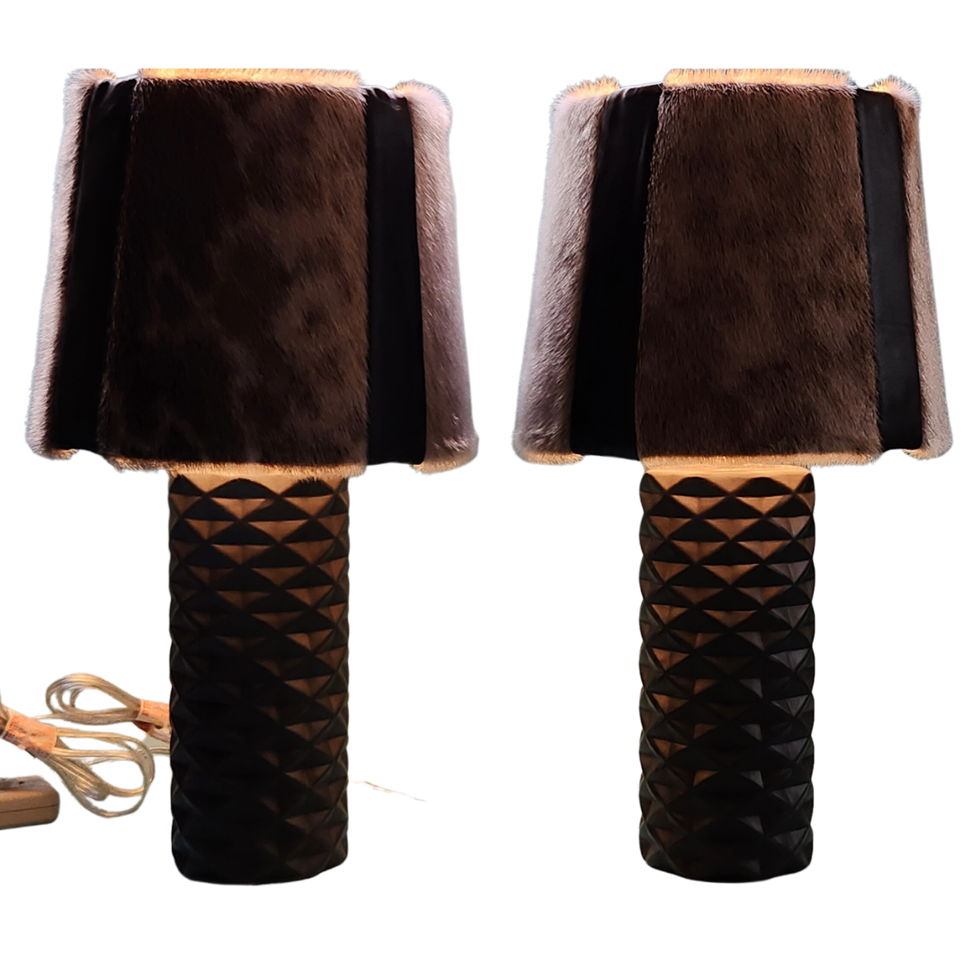 Nunavut ring seal is beautifully showcased with black lambskin on to create unique and elegant lampshades on a black ceramic base. A stunning home decor statement and conversation piece, these lamps are an Inuit design for everyone to enjoy. Standard household power cord and 2 prong plug. Light bulb not included. Sealskin is naturally insulative, customer should follow manufacturer’s guidelines on lamp use. Do not leave lamp unattended while switched on. Seller accepts no liability in how product is used.