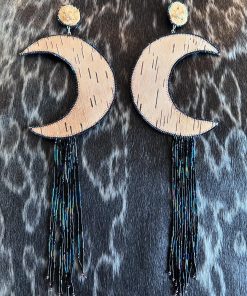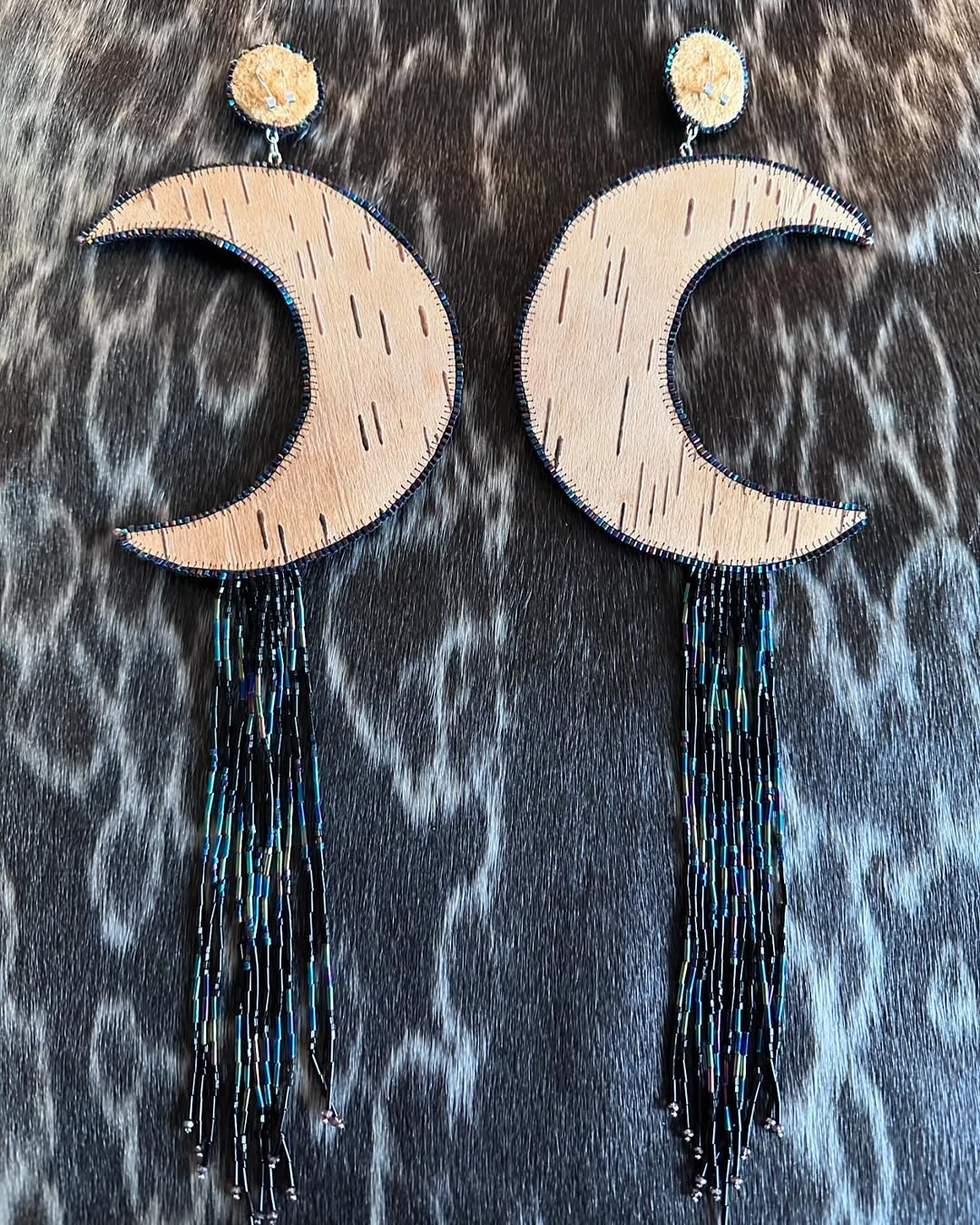 Black sealskin moons with birch bark backing, sealskin and home-tanned hide clasps, and beautiful fringe. These statement pieces sit at 14 inches and are available at the collab show with @auntycollective