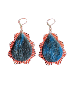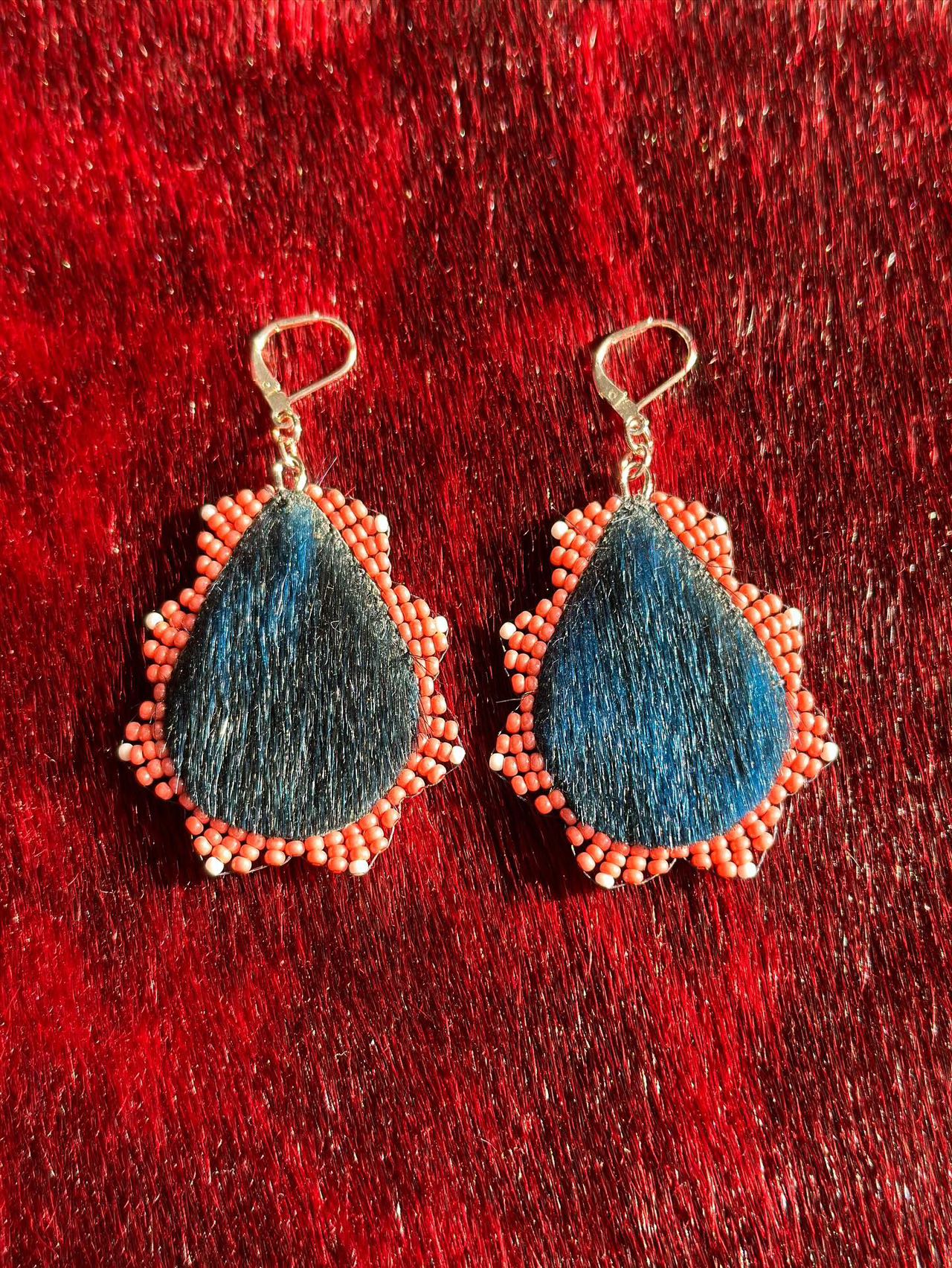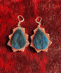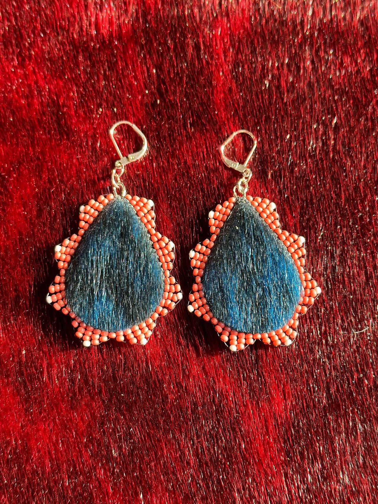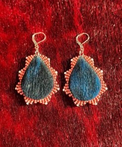 Introducing Katie’s Blue Sealskin Drop Earrings! These beautiful 2-inch earrings feature blue dyed sealskin, a durable deer hide backing and are decorated with size 10 seed beads. Perfect for adding a touch of elegance to any outfit.