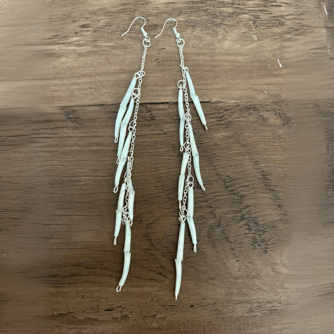 Dentalium Shell Earrings (Aqua, 19 cm). Featuring delicate aqua-coloured Dentalium shells attached to a lightweight chain, these earrings offer a graceful flow and a coastal-inspired charm. Perfect for both everyday wear and special occasions.