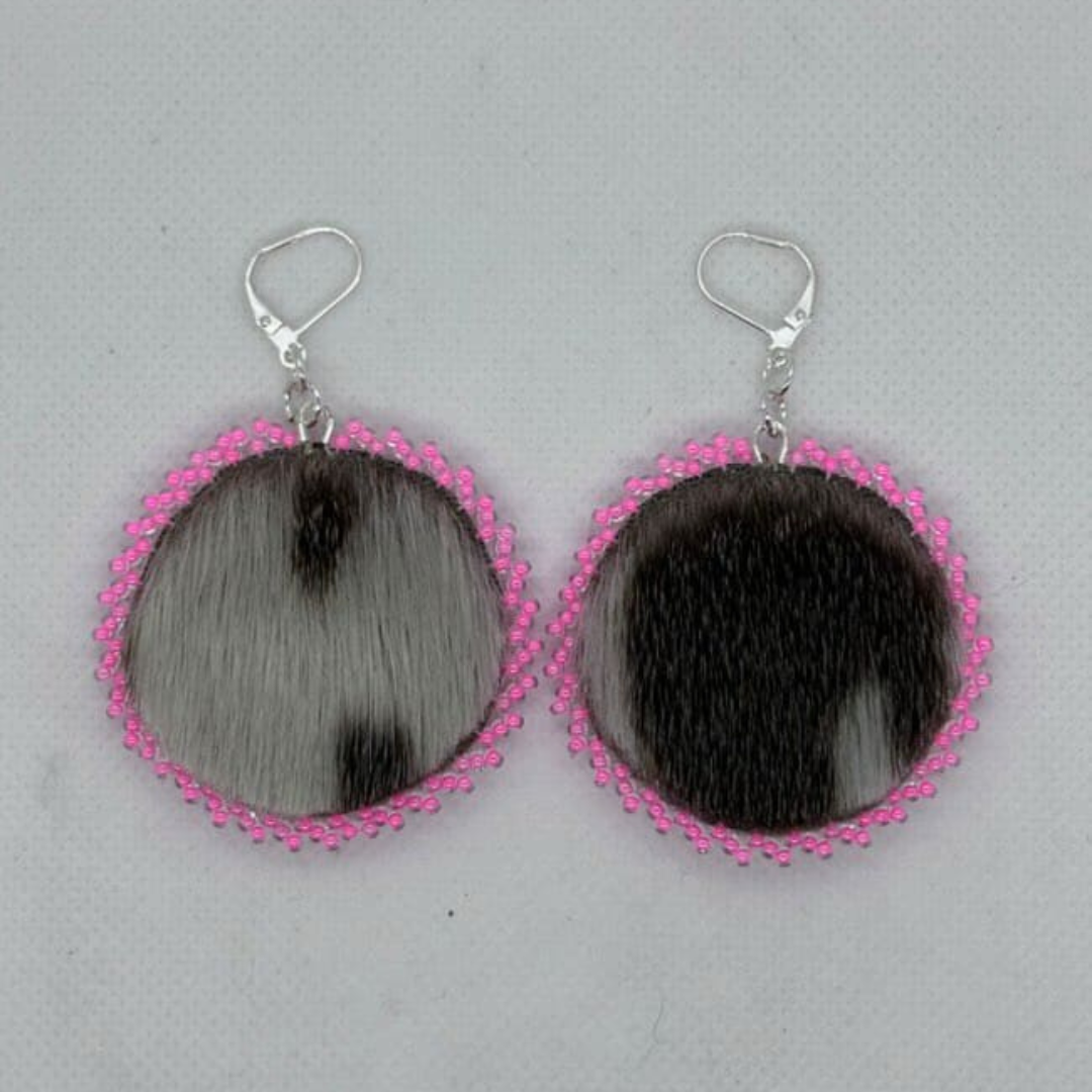 Elegant Natural Sealskin Circle Earrings featuring a unique design with pink edging. Crafted from premium sealskin and accented with beads, these earrings are finished with silver-plated hooks and measure 2.5 inches long.