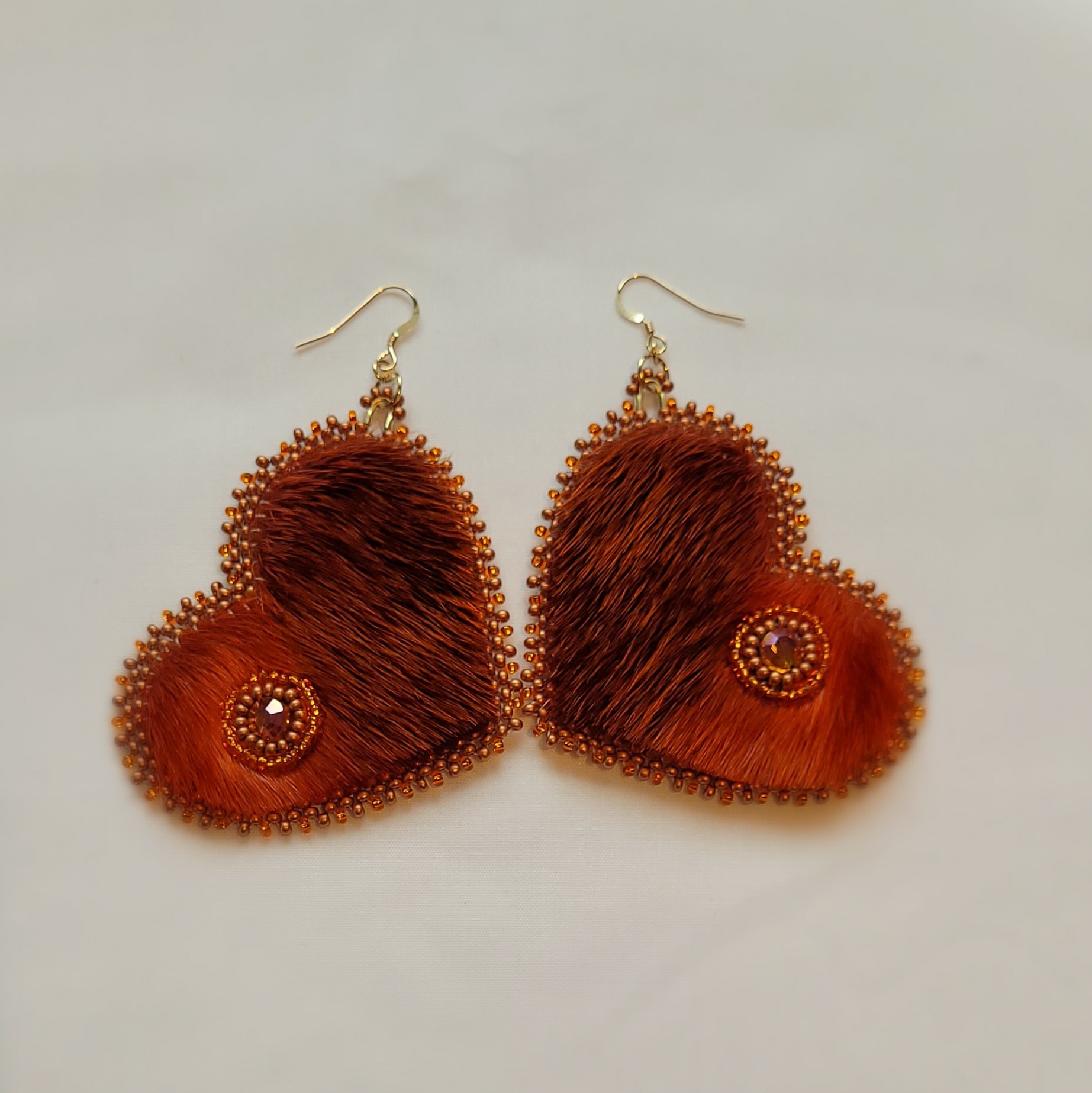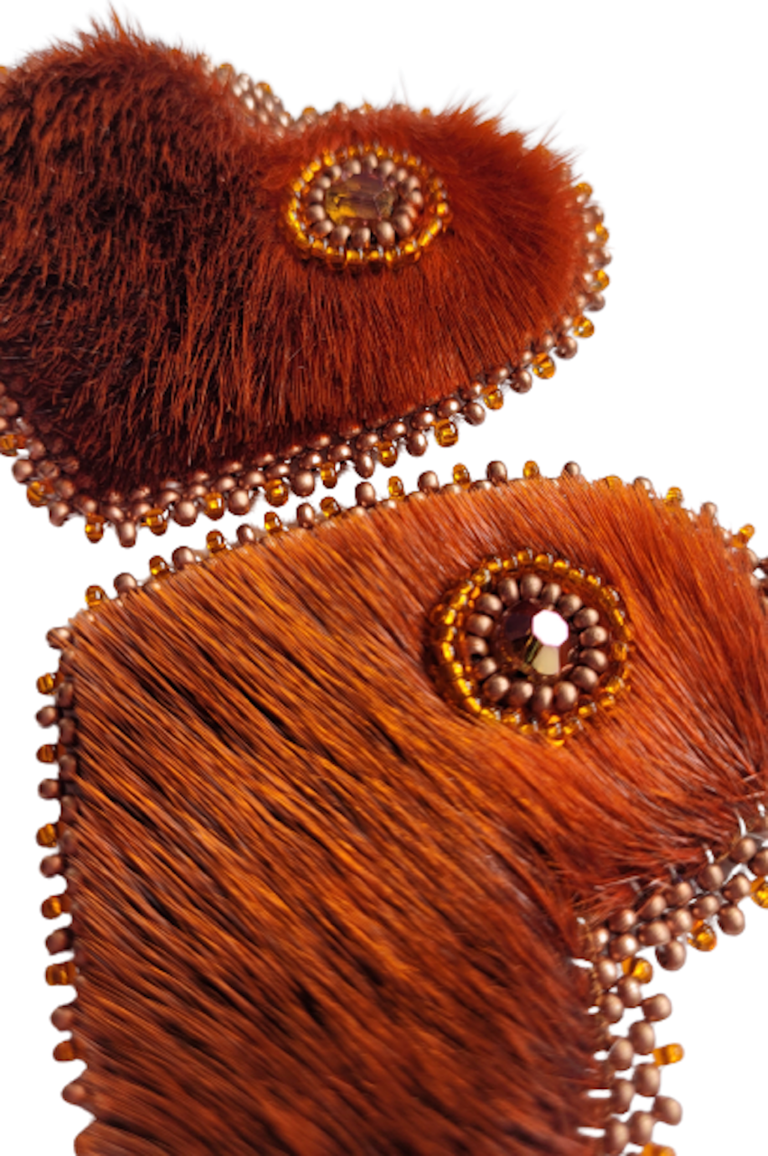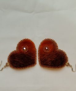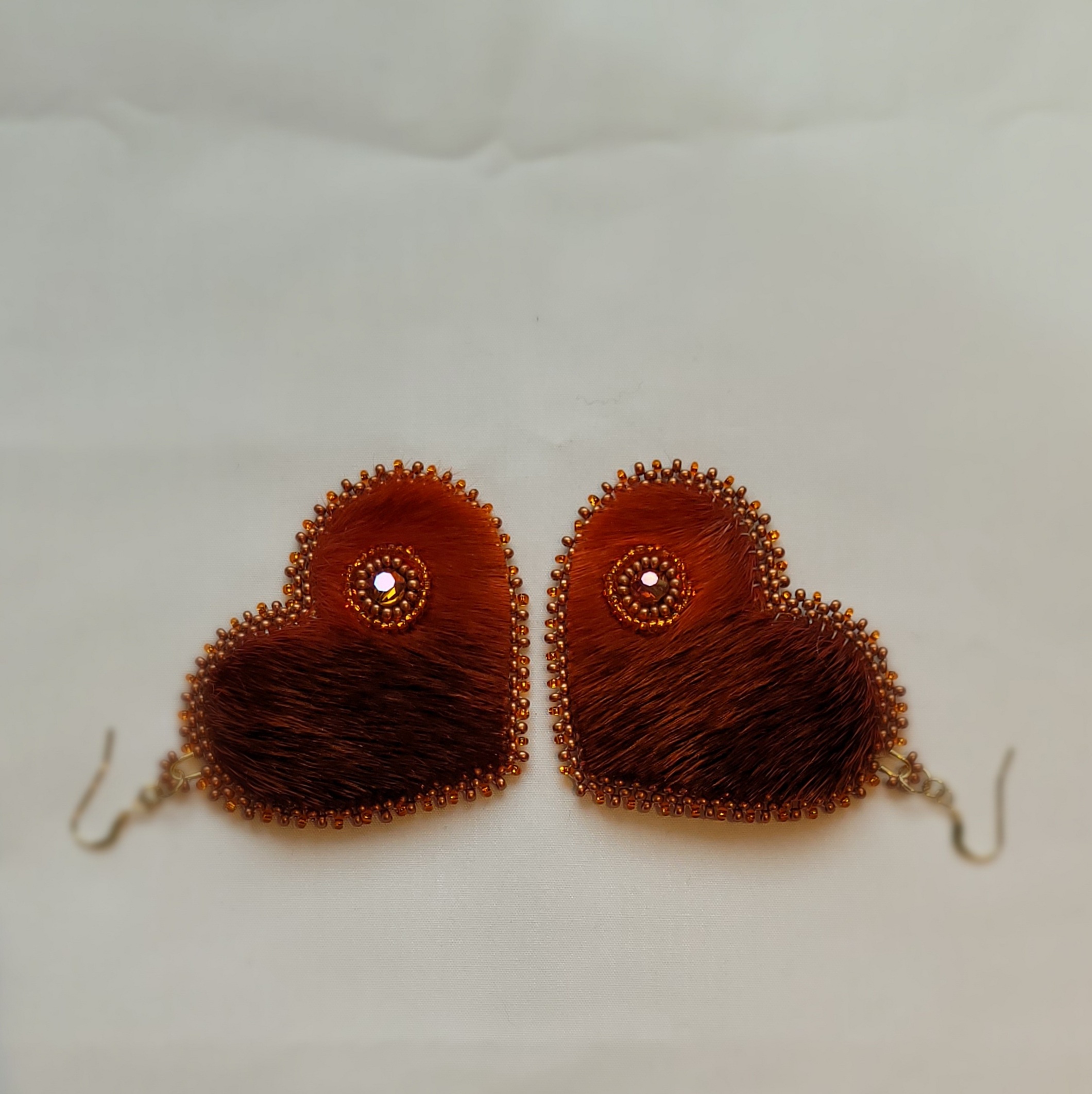 Hand crafted, Inuit made Sealskin heart earrings. Each heart features a seal eye hole embellished & edged with lentil & glass seed beads and gold filled findings. Make a statement in these lightweight gorgeous earrings.