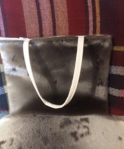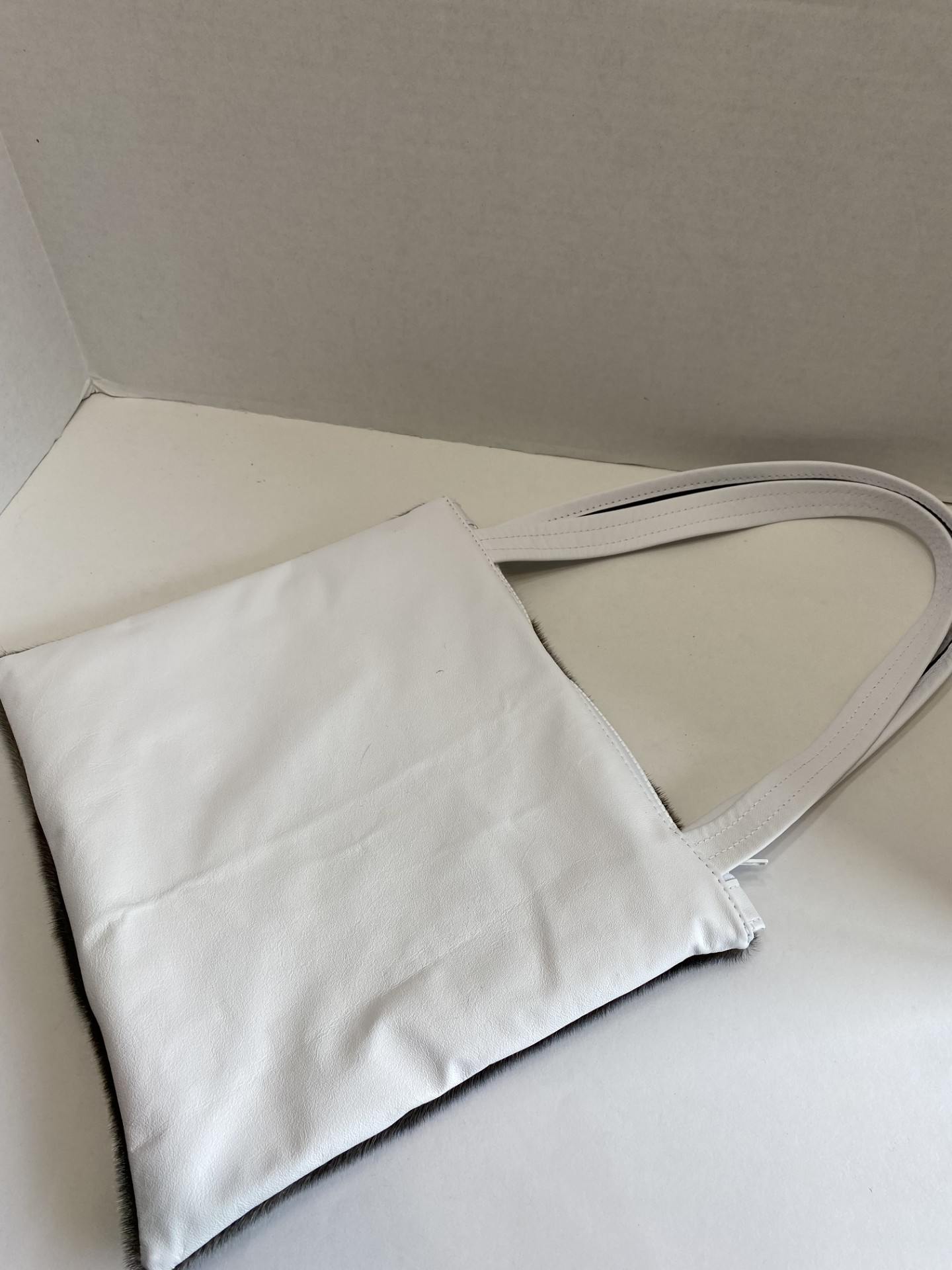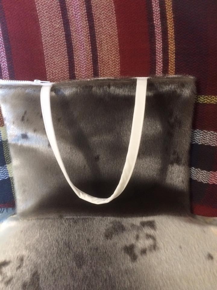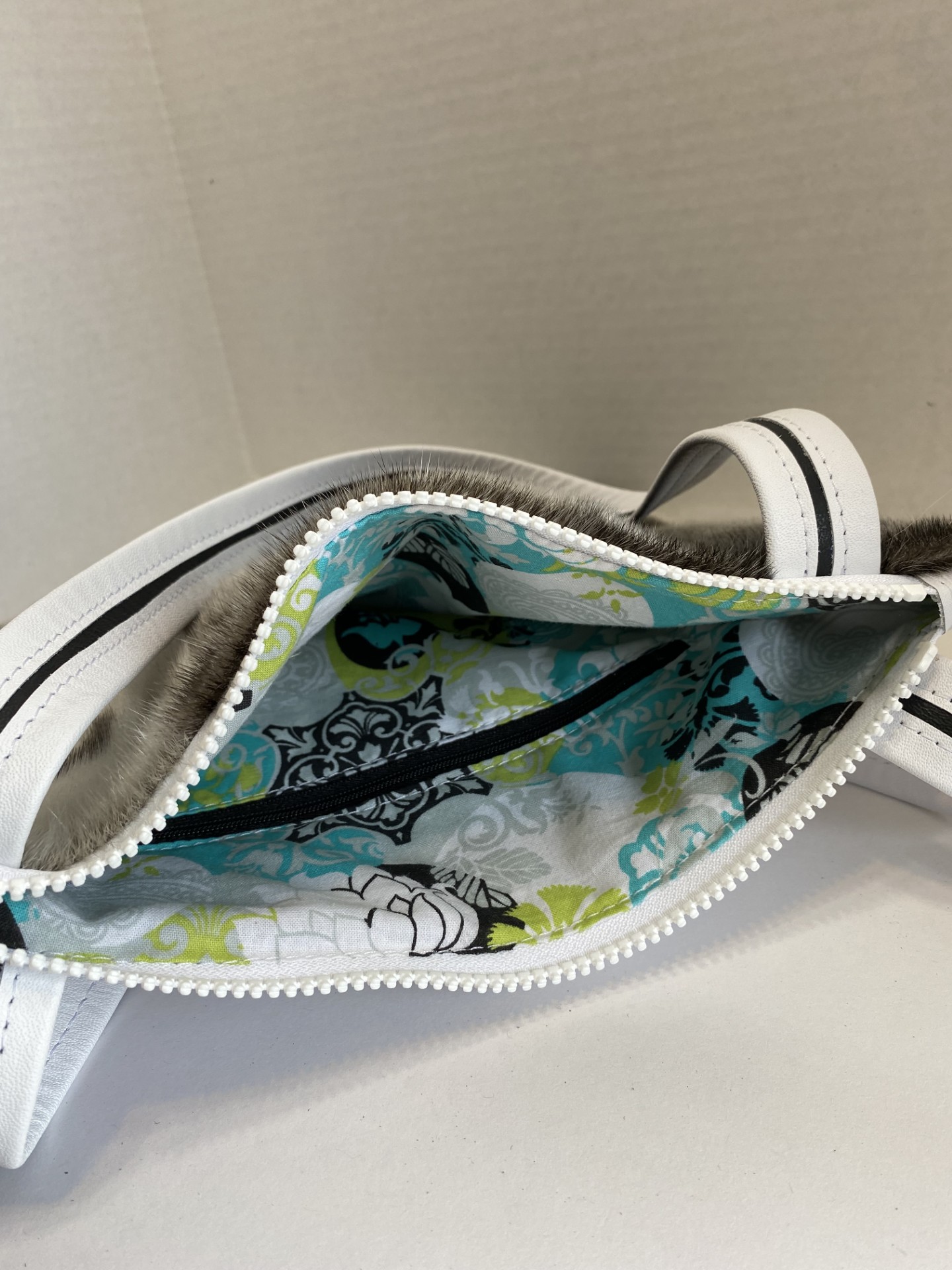 The Sealskin and Leather Purse is made from sealskin and leather. The available leather colors are black, white, bison, and brown. It comes in one size.
