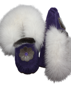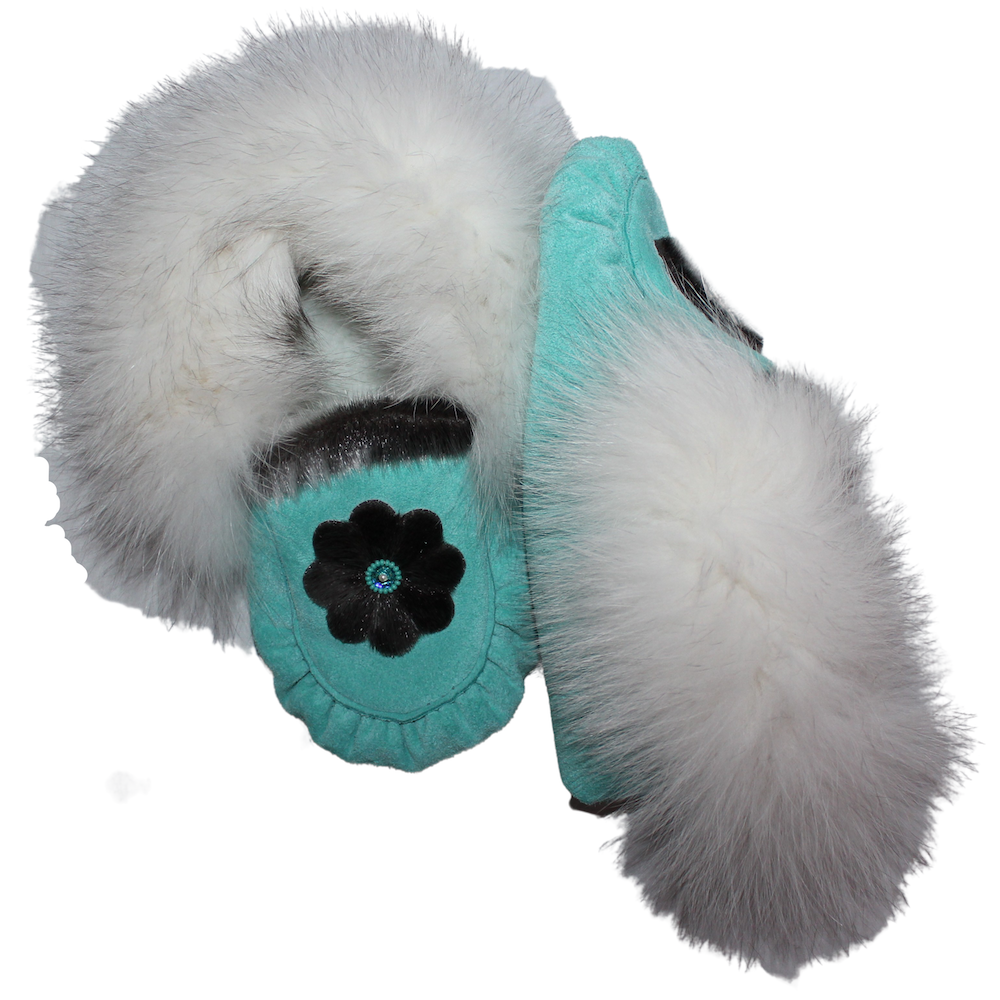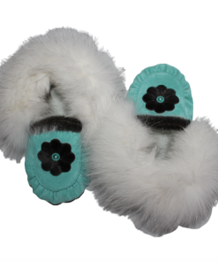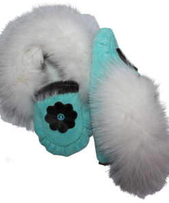 These exquisite one-of-a-kind Slippers are designed and created with the utmost quality and care. Made with Turquoise split hide, embellished with a gorgeous sewn Sealskin Flower, lined with pile lining, and trimmed with Blue Fox fur! Your toes are sure to be toasty warm in these Beautiful modern handcrafted slippers.