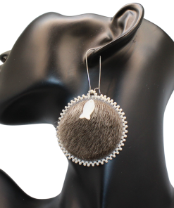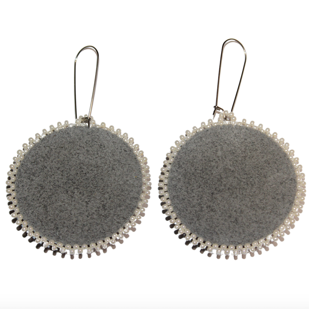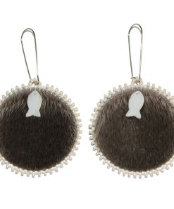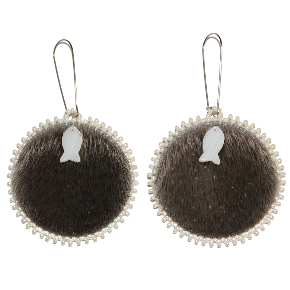 Natural Grey Sealskin, Mother of Pearl fish gem, Czech seed beads, grey moosehide backing, Kidney hooks.