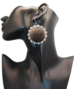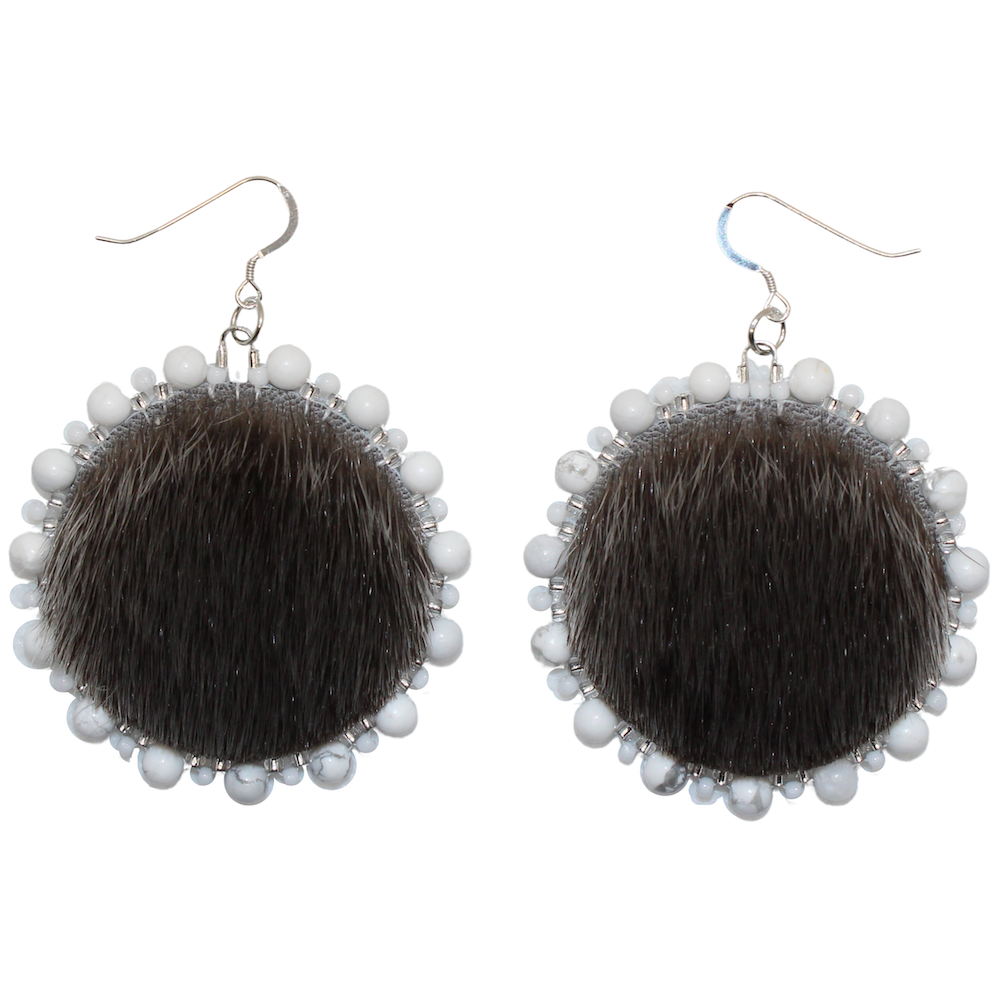 Natural Grey Sealskin, Natural howlite (the grey streaks in the white howlite compliment the natural sealskin), Czech seed beads, Stirling Silver hooks, grey moosehide backing.