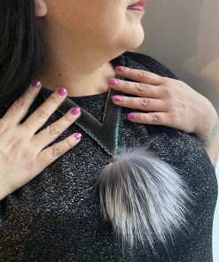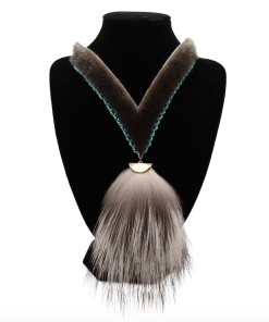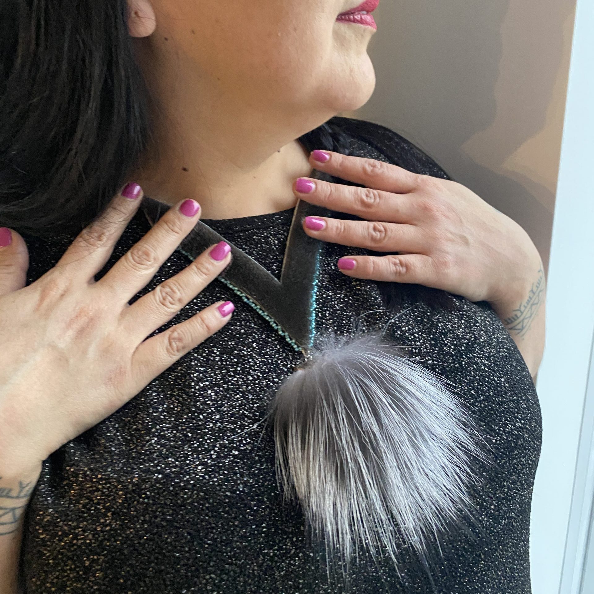 This elegant Sealskin necklace was inspired by my signature earrings. Both complement each other. The V shape Sealskin resembles a tattoo, located on the forehead, which signifies entering womanhood for us Inuit. The Silver fox fur adds a contemporary look that will leave you feeling timeless. Handcrafted with the utmost love and care. Made with Natural Sealskin from our waters, silver fox fur-embellished with Czech seed beads. Backed with complimentary grey moose hide. Black leather lacing. Made with fine materials only.