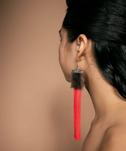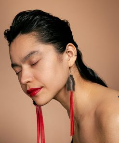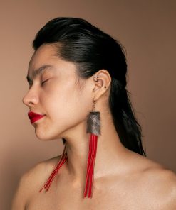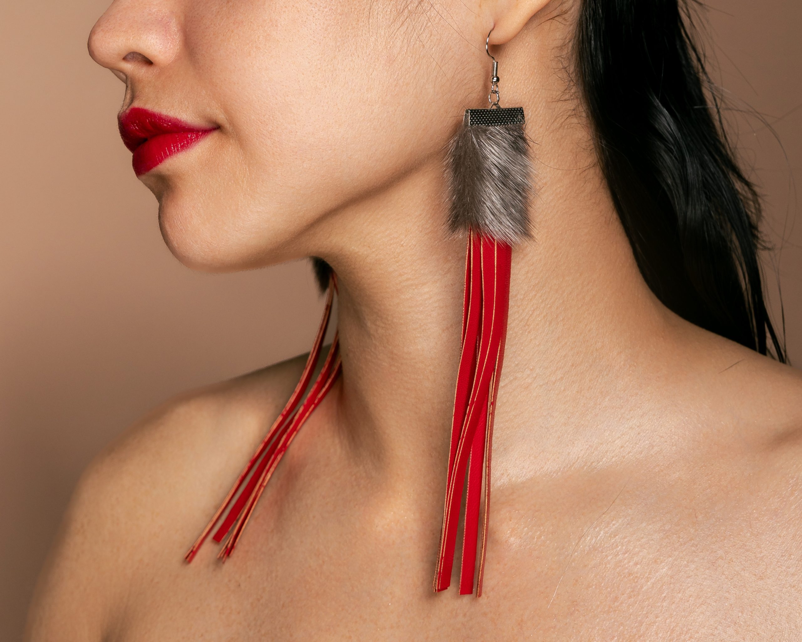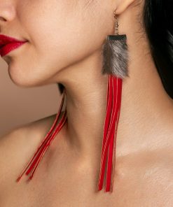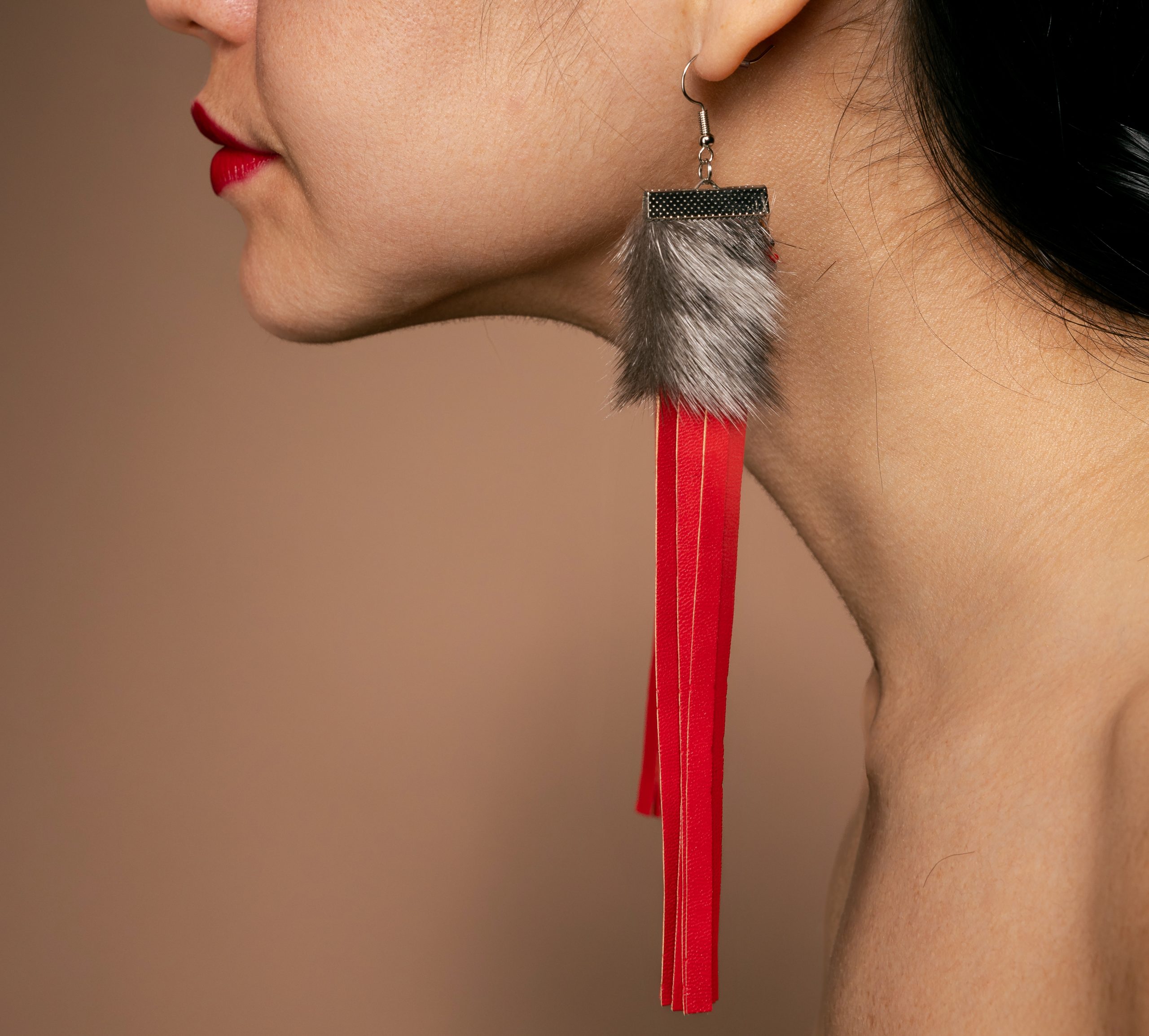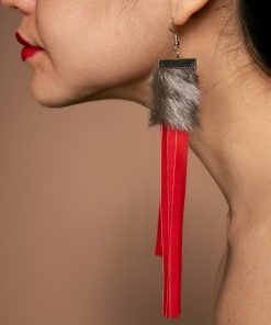 Elevate your style with Andrea’s Silver Sealskin Earring with Red Fringes, a unique blend of sophistication and vibrant design. Crafted from red leather and adorned with sliver seal, accented by stylish red and black beads on the sides.