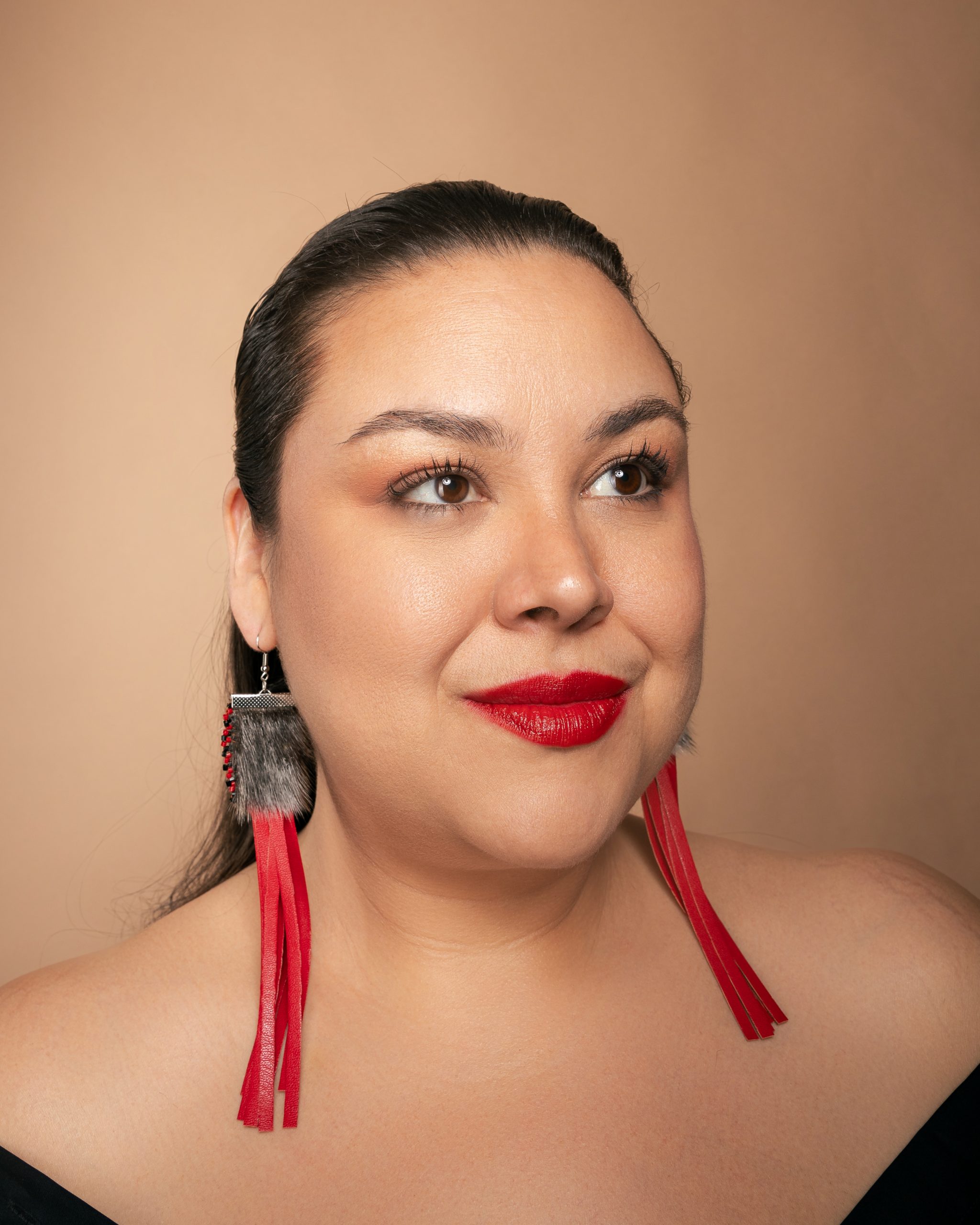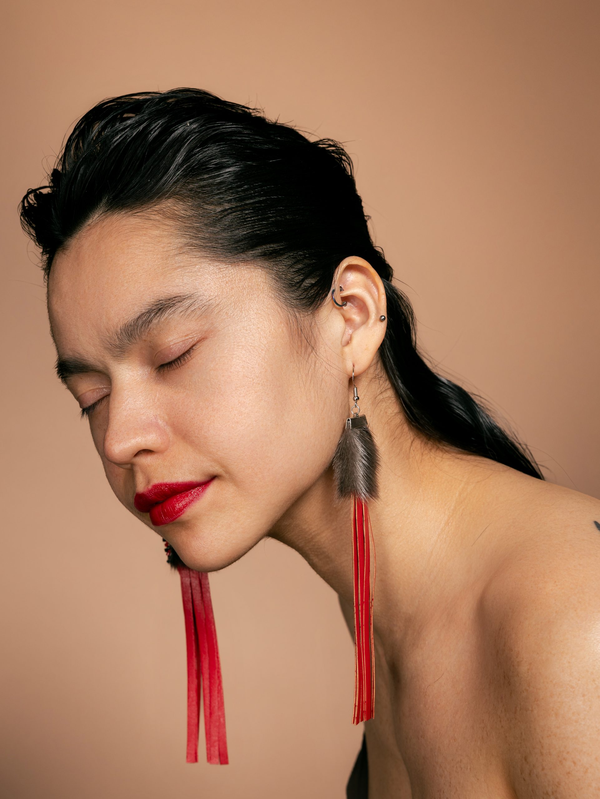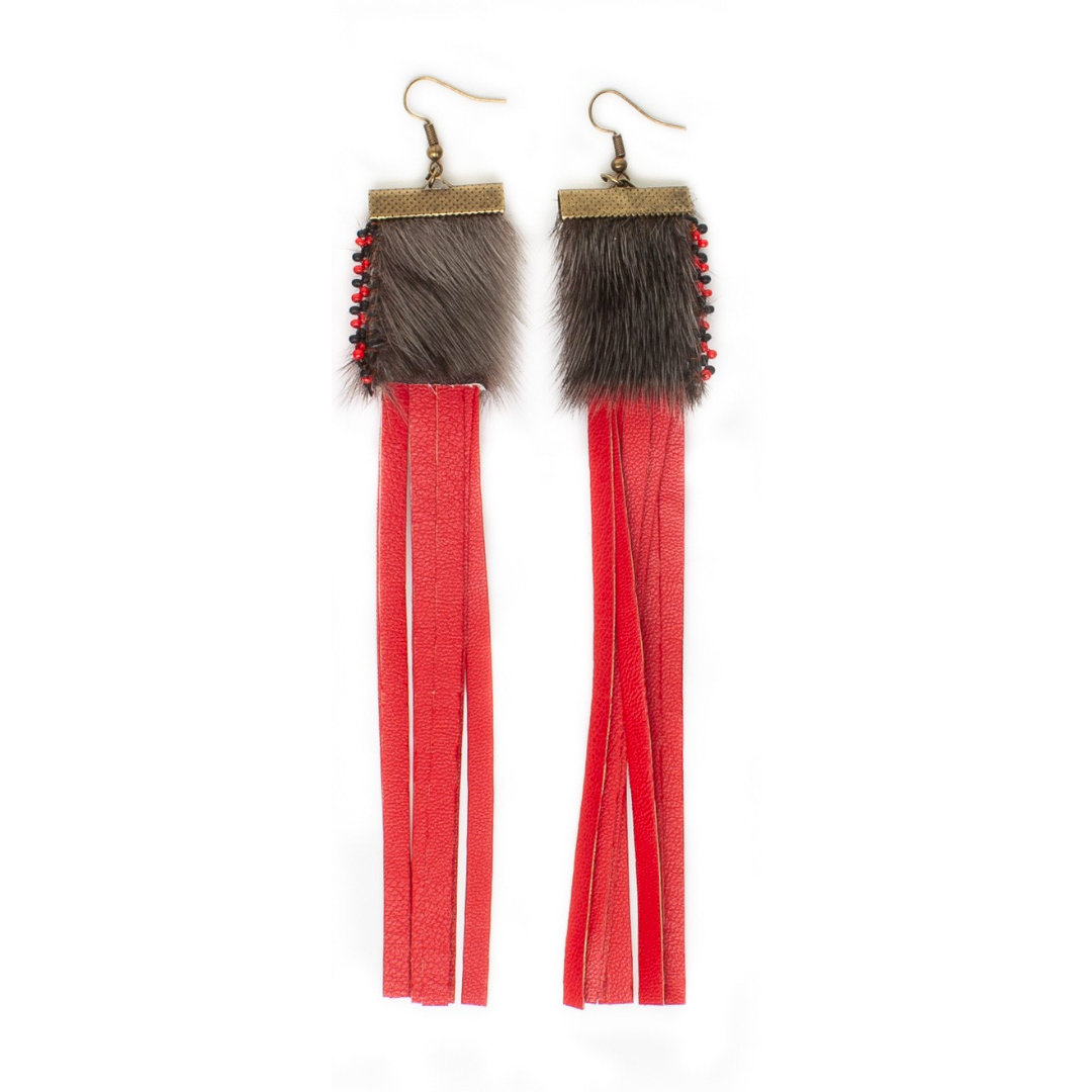Elevate your style with Andrea’s Silver Sealskin Earring with Red Fringes, a unique blend of sophistication and vibrant design. Crafted from red leather and adorned with sliver seal, accented by stylish red and black beads on the sides.