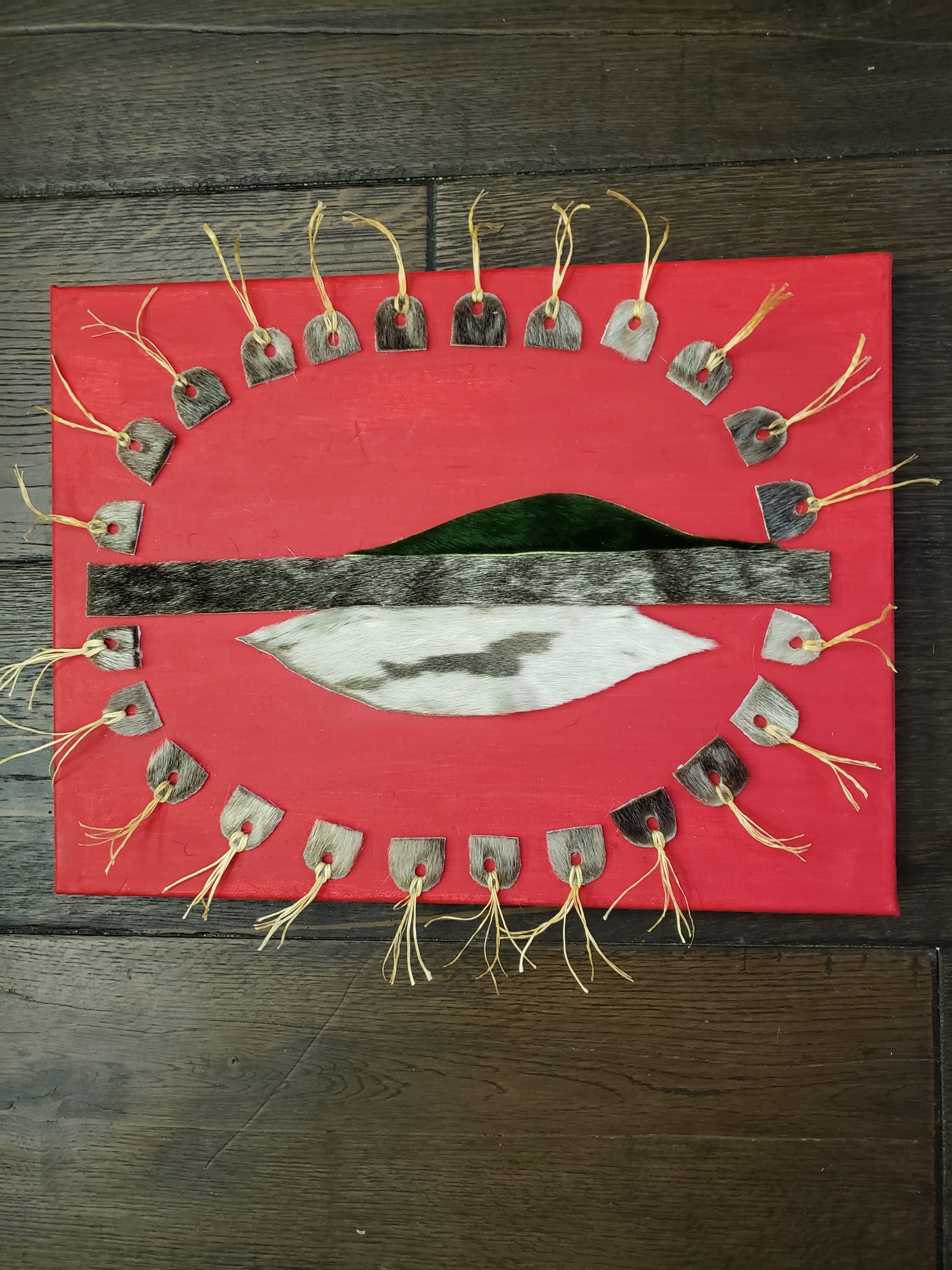Sealskin on painted canvas: A community of houses with sinew ties representing togetherness. They circle around sealskin pieces ŕepresenting nature’s.world at the centre of each community that all need to protect.