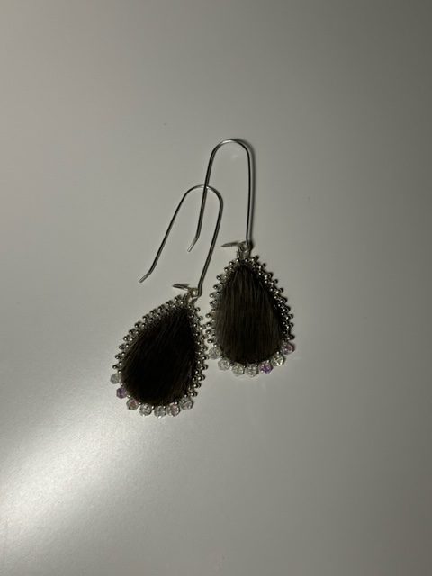 Peau de phoque, crochets en argent sterling, cristal Swarovski, cuir de bœuf musqué