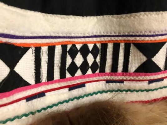 “At first,” agrees May Ningeongan, “it is difficult but, once you know how to work with sealskin, you get the hang of it. My mother and I hand sew the sealskin/leather in order for it to be perfectly sewn. . Sealskin brings the traditional look/warmth to our garments. That is the main thing we love working on because it’s so beautiful, warm and elegant. The sealskin makes me feel like I’m closer to our ancestors.” May adds.