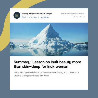 Summary: Lesson on Inuit beauty more than skin-deep for Inuk woman (2/1/2023) - Muckpaloo Ipeelie, an Inuk lady who lives in The Blue Mountains and is the creator and CEO of the Urban Inuit Identity Project, came to the local class to speak more about the traditions. Last week, she worked as a guest instructor and taught Grade 9 cosmetology students at Collingwood Collegiate Institute about Inuit… Continue Reading