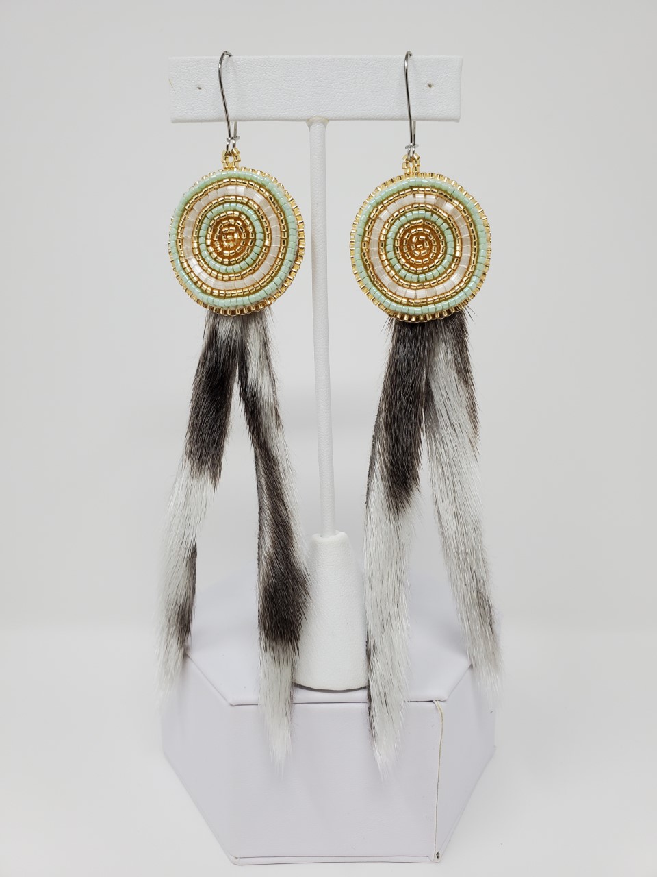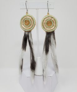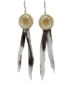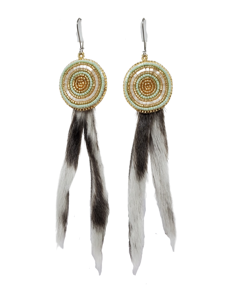 Gold, green and white beads. Natural sealskin. Silver colour hooks.