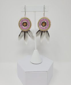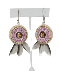 Gold, green, white, pink and purple beads. Natural sealskin. Silver colour hooks.
