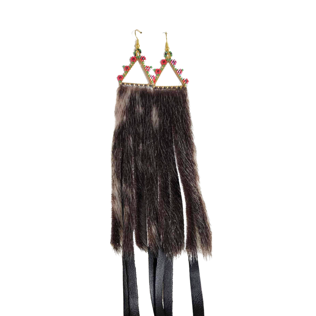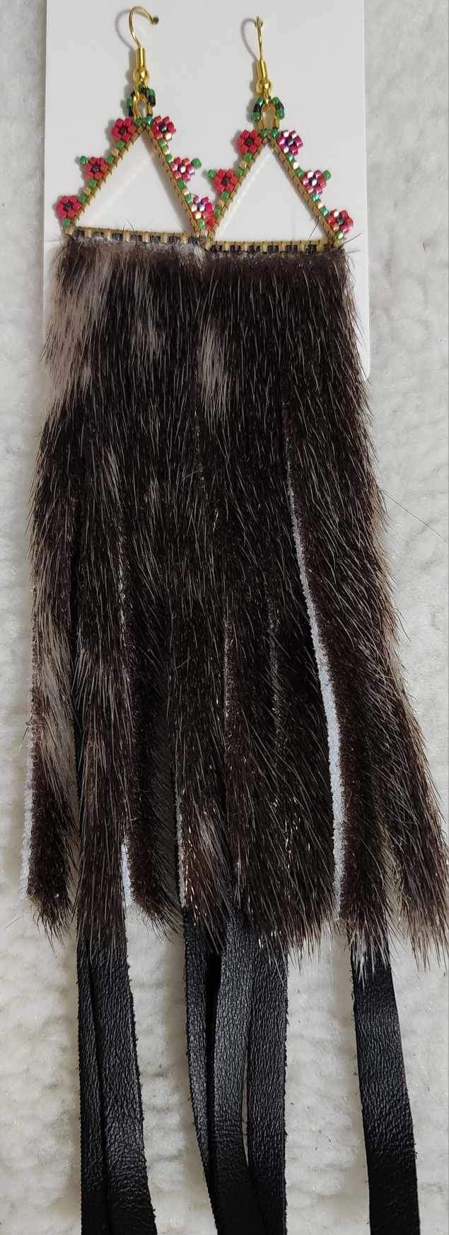 These elegant Beaded Sealskin Earrings showcase exquisite craftsmanship, measuring 8 inches in length. The geometric beadwork adds a unique touch to these cultural treasures. Handcrafted with precision, these earrings are a stunning blend of traditional and contemporary design, making them a symbol of artistry and cultural heritage.