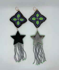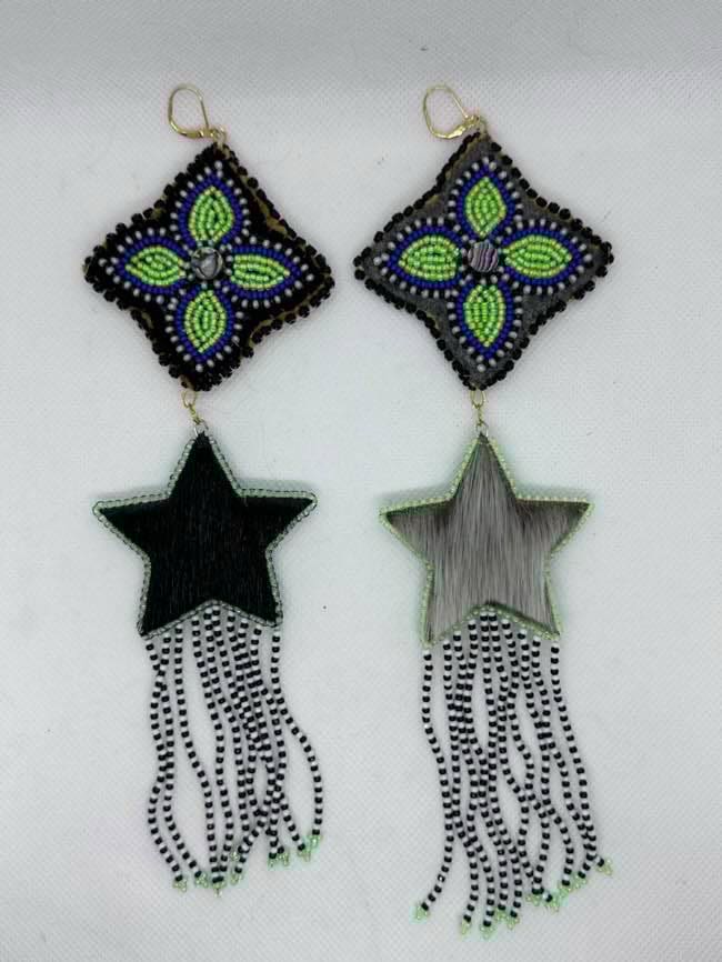 Beetlejuice-inspired earrings featuring florals and sealskin stars, adorned with white and black fringe. Statement pieces at 8.5 inches!