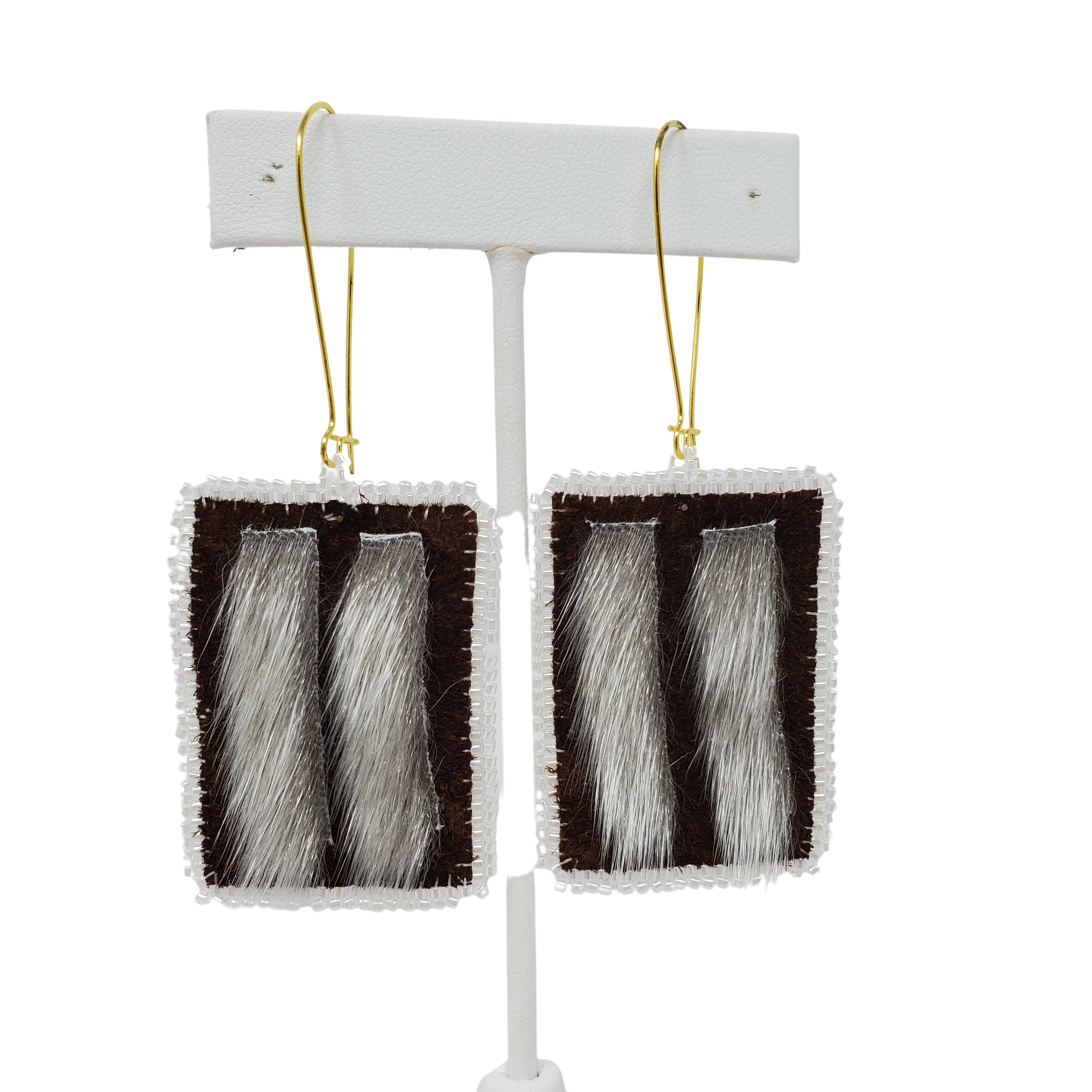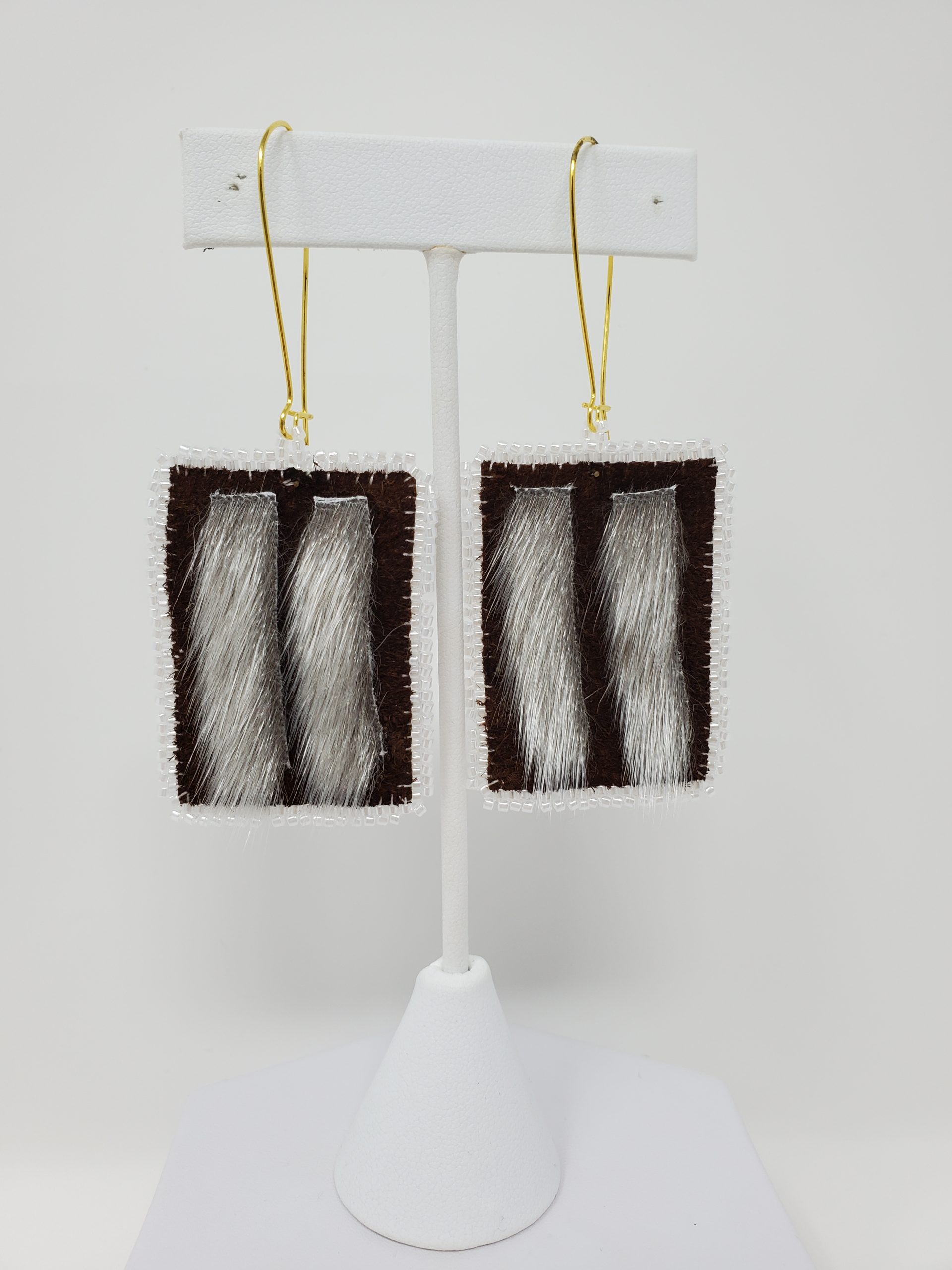 These earrings are made from bison leather, sealskin, and beads, giving them a unique look that will make you stand out in the crowd.