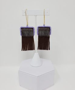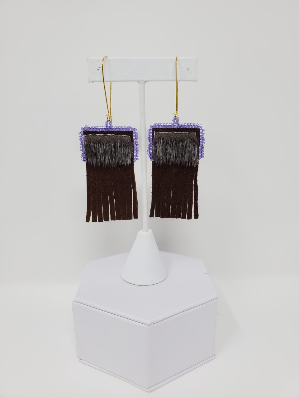These earrings are made from bison leather, sealskin, and purple beads, giving them a unique look that will make you stand out in the crowd.