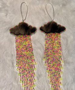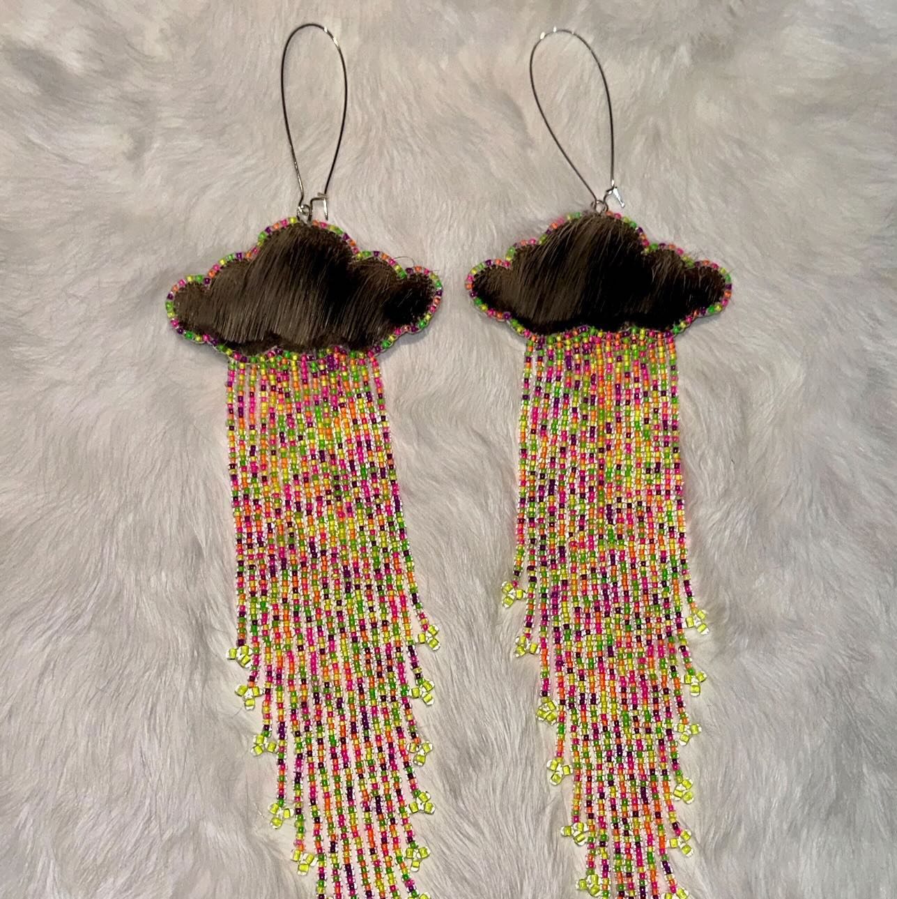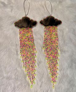 Make a statement with these Natural Sealskin Cloud Earrings, featuring double-sided sealskin, neon size 11 seed beads, and a playful neon bead soup fringe. Hanging 9.5 inches long on silver-plated hooks, these unique earrings are hand-crafted over 10 hours. Bold, luxurious, and full of movement