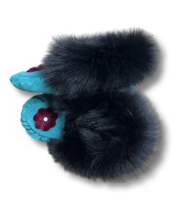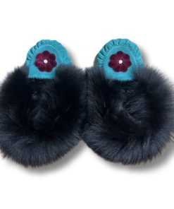 Featuring exquisite dyed blue fox fur, sealskin, and intricate glass bead detailing, these slippers are truly unique and eye-catching. The dyed blue fox fur adds a touch of elegance and sophistication, while the glass bead detailing provides a unique and artistic touch.
