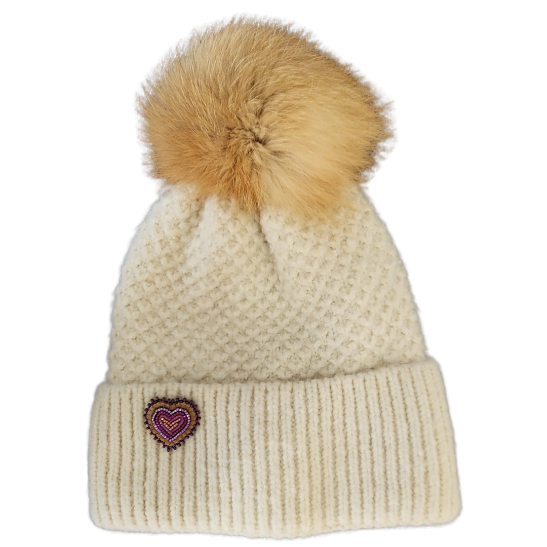 Elevating the classic knit toque with a northern twist! A factory knit hat with hand crafted fox fur pom-pom and beaded sealskin adornment, look fabulous this winter in a unique and one of a kind winter accessory. An Inuit design that everyone can wear.