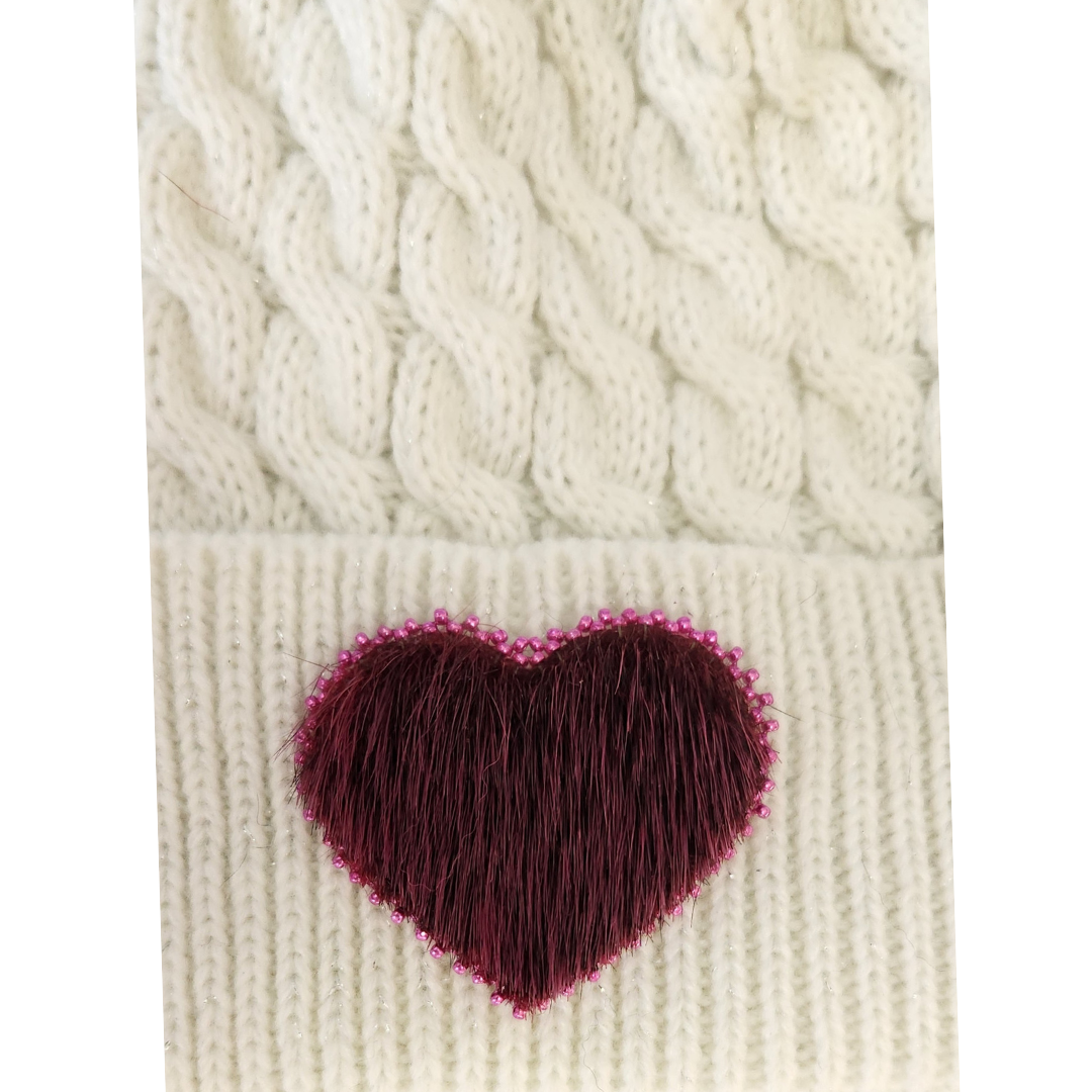 - Cream hat, orange pom, purple moosehide heart