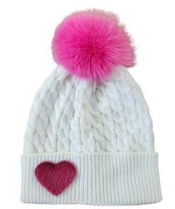 - White hat, blue fox pom, pink seal heart
