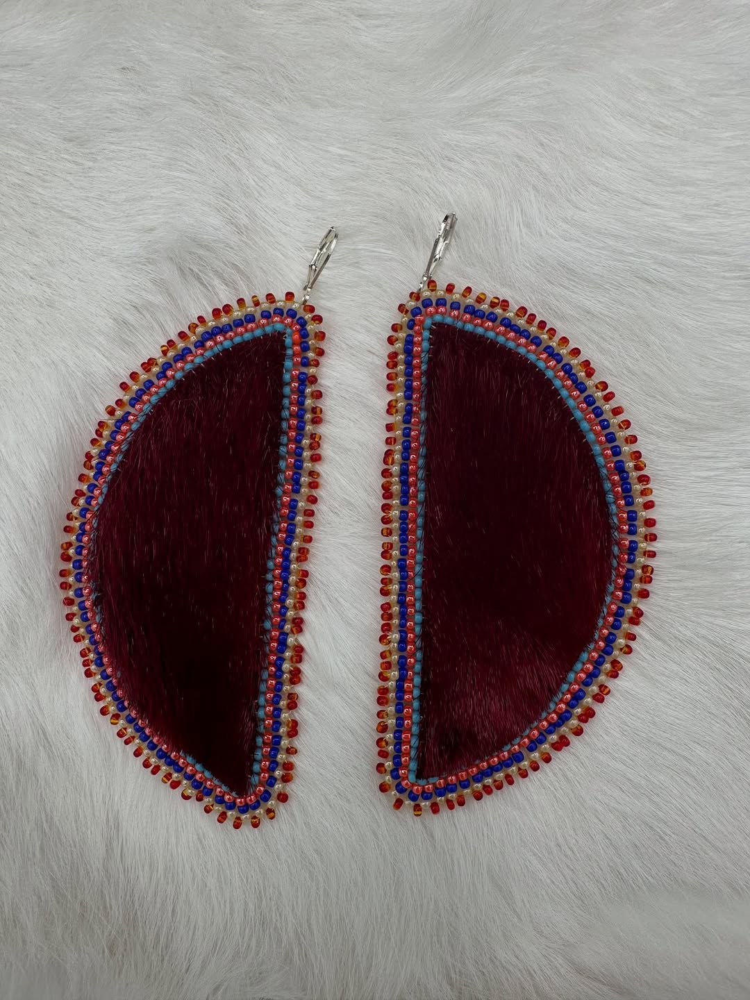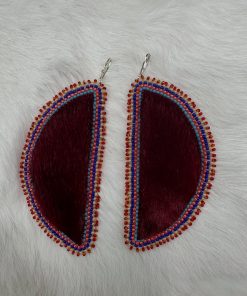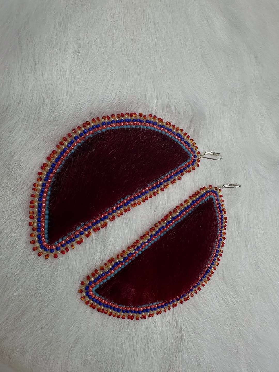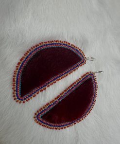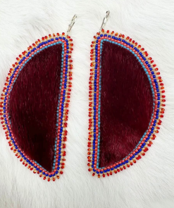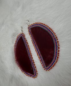 These striking red sealskin earrings by Olepika are inspired by the moon’s changing phases. They feature hypoallergenic hooks and a lightweight yet durable design. Measuring approximately 10 cm long by 5 cm wide, they make a powerful word.