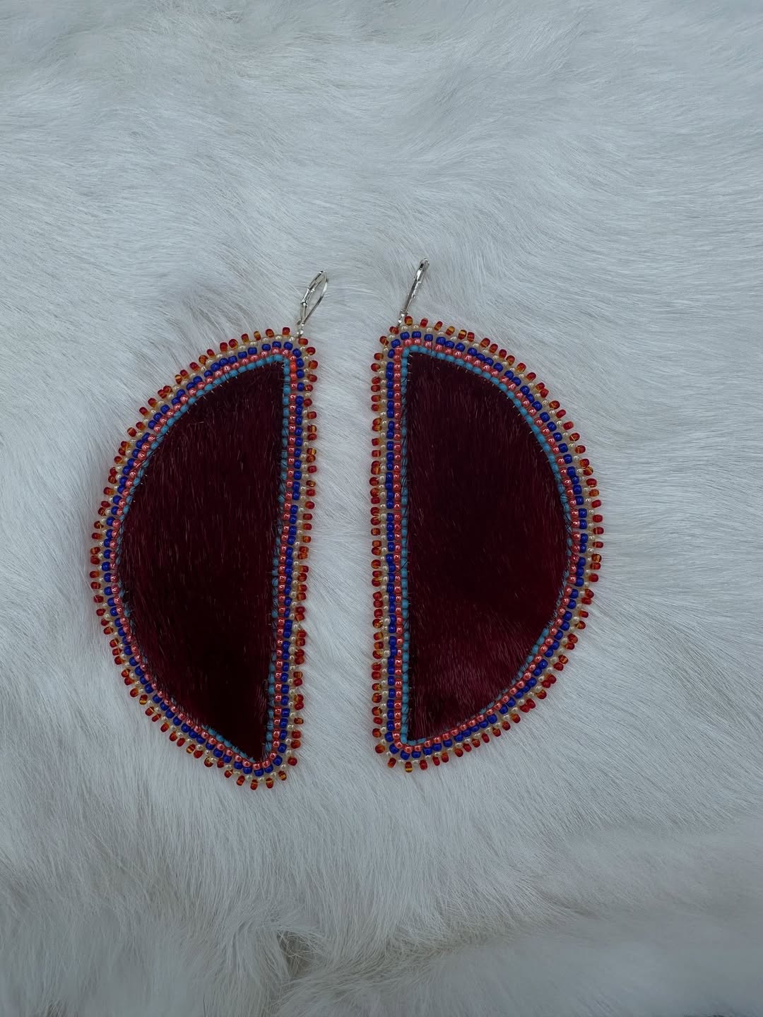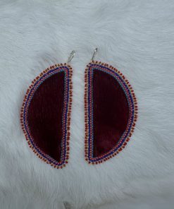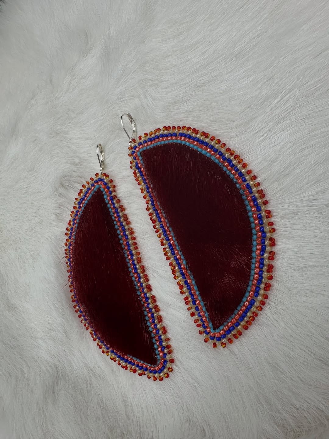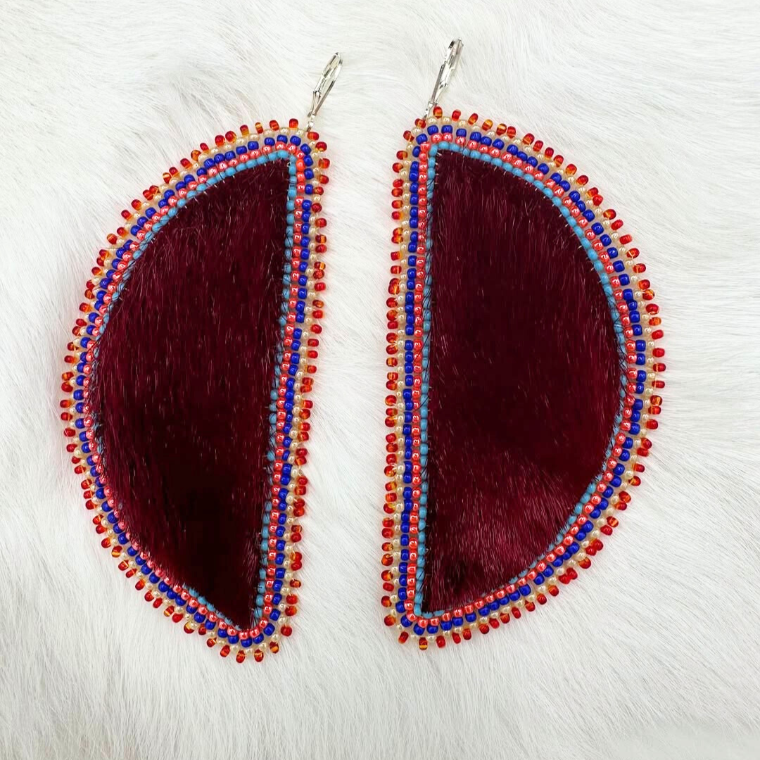These striking red sealskin earrings by Olepika are inspired by the moon’s changing phases. They feature hypoallergenic hooks and a lightweight yet durable design. Measuring approximately 10 cm long by 5 cm wide, they make a powerful word.