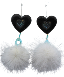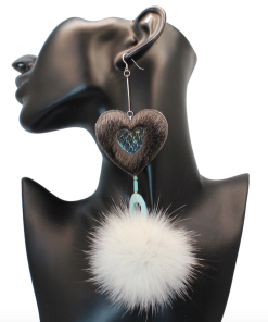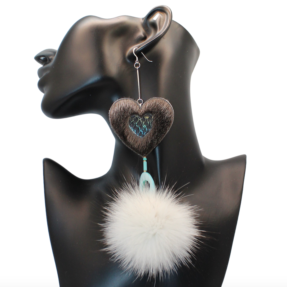 Gorgeous Sealskin earrings—Inuit designed—with center designs of Salmon skin leather. The blue Fox fur pompom adds an overall elegance. Embellished with Czech beads and Shell beads, backed with black split hide. Sterling silver hooks. Handcrafted with the utmost love and care. Made with Natural Sealskin from our waters, blue Fox fur-embellished shell, rondelle, and seed beads. Made with fine materials only.