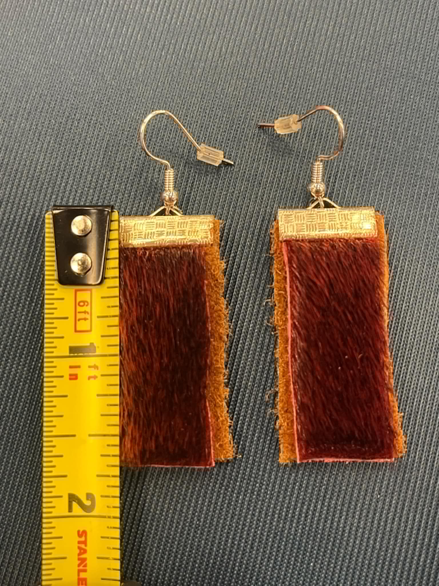 Elegant hide earrings adorned with vibrant dyed red sealskin, featuring a 1.7-inch fringe for a bold and eye-catching design.