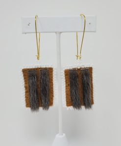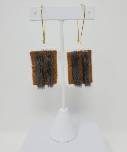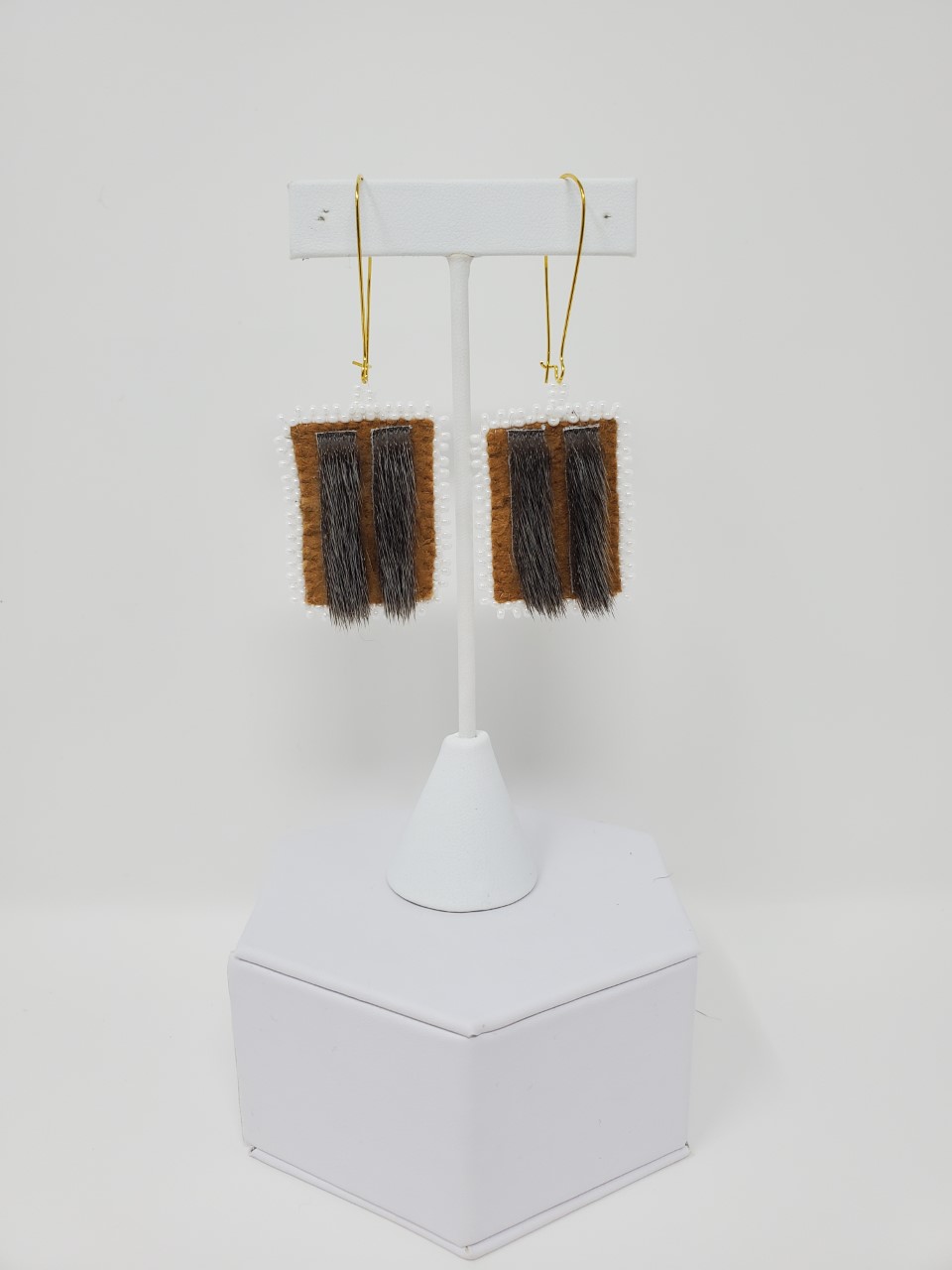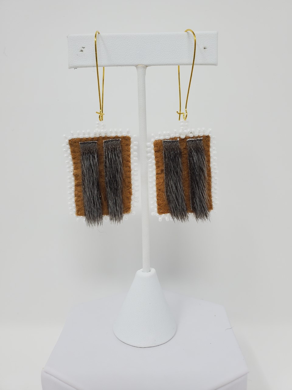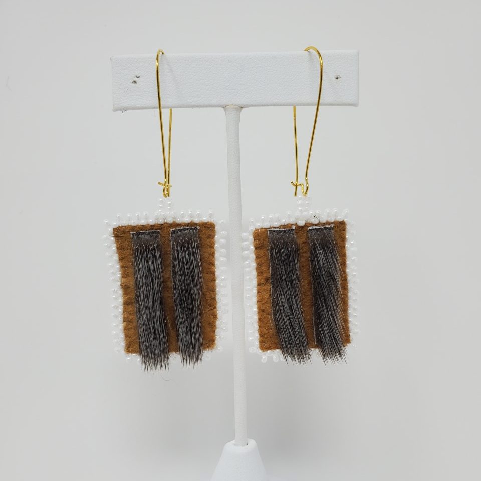 These earrings are made from home-tanned moosehide, sealskin, and white beads, giving them a unique look that will make you stand out in the crowd.