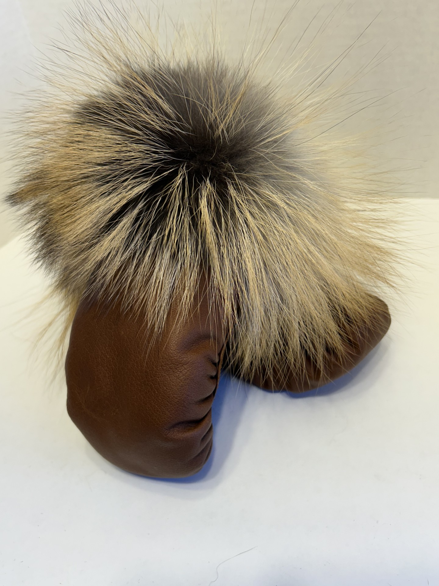 Ladies’ Bison Curved Leather Mitts with Cross Fox Fur (Made to Order) – sealskin option also available.