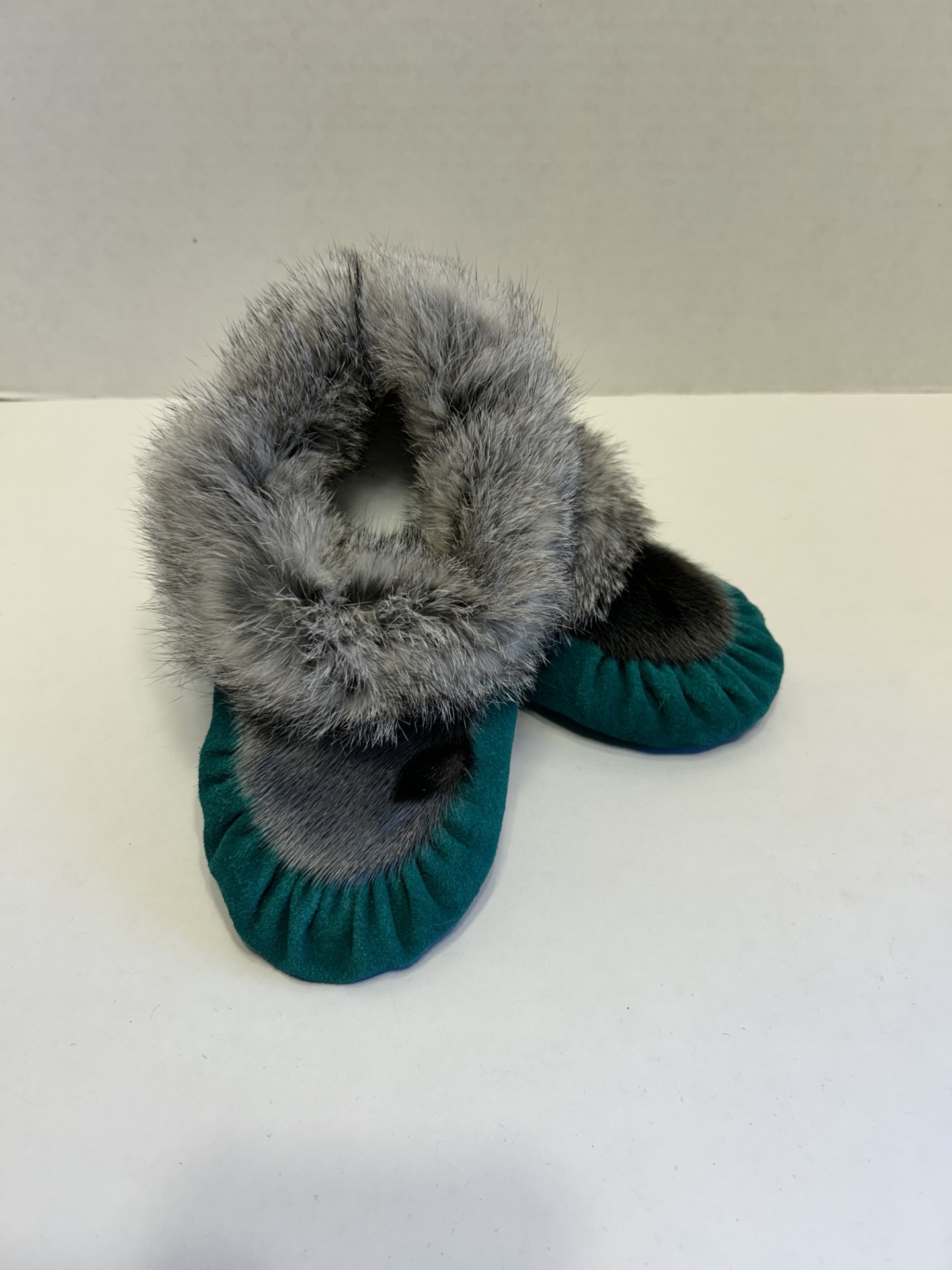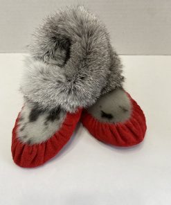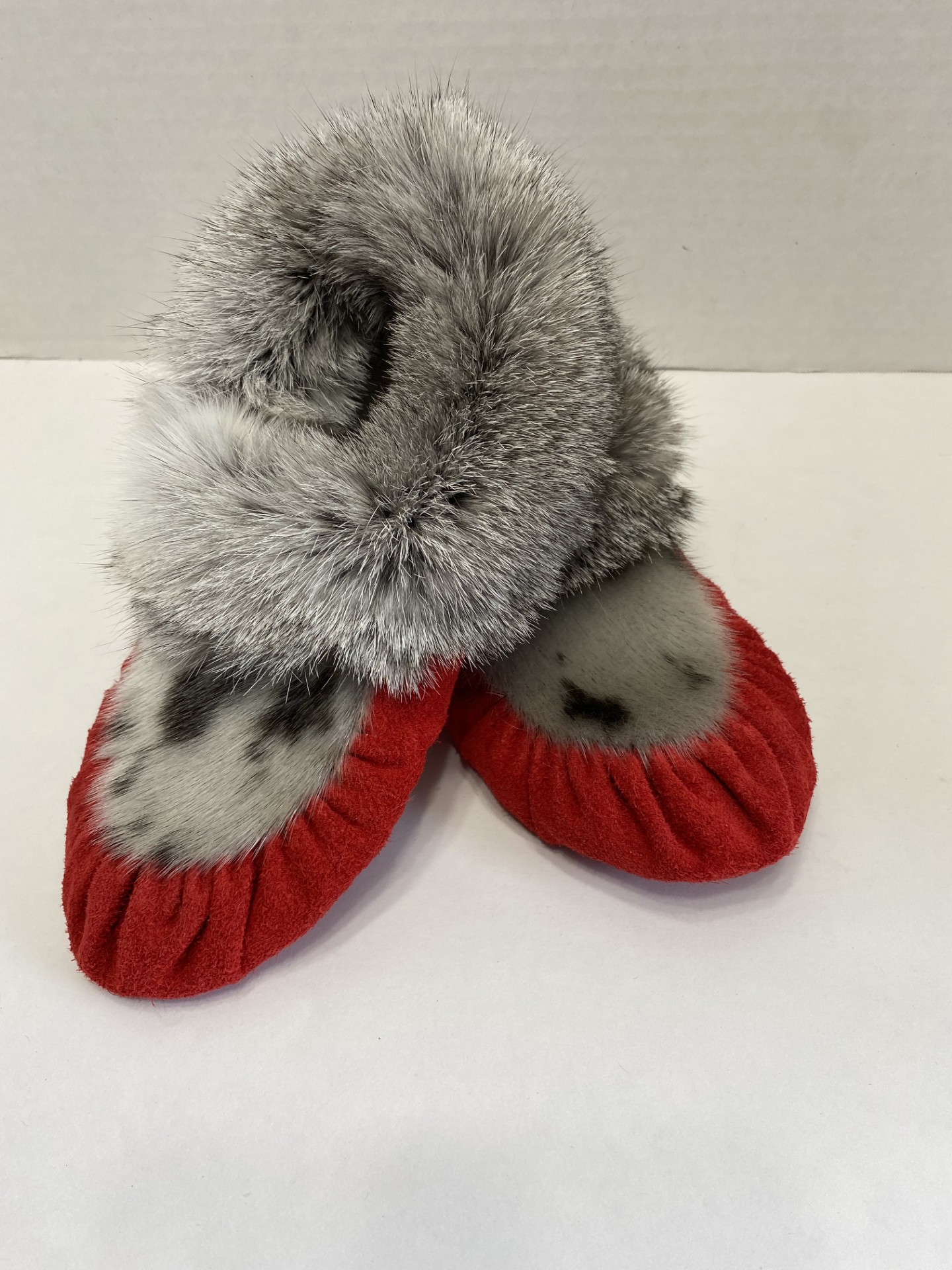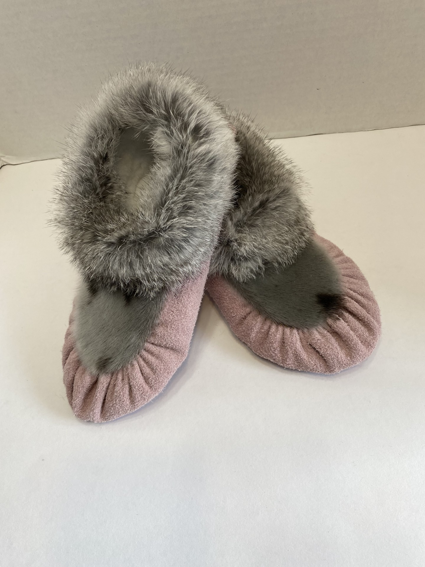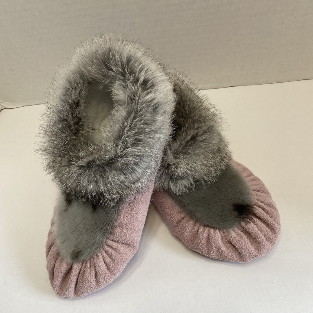 Ladies’ Sealskin and Moosehide Slippers (Made to Order). Featuring soft rabbit fur accents, each pair is custom-made to your preferences and comes in a variety of stunning colours, ensuring a unique and comfortable fit.