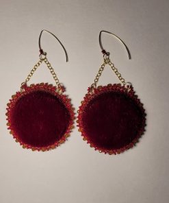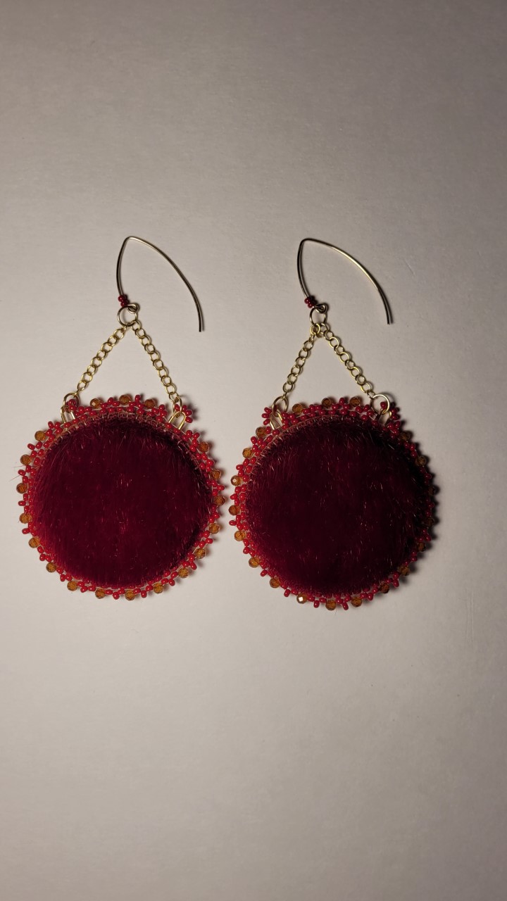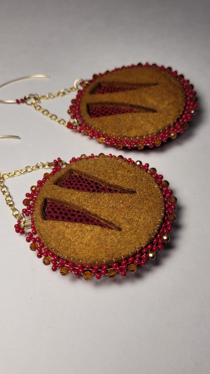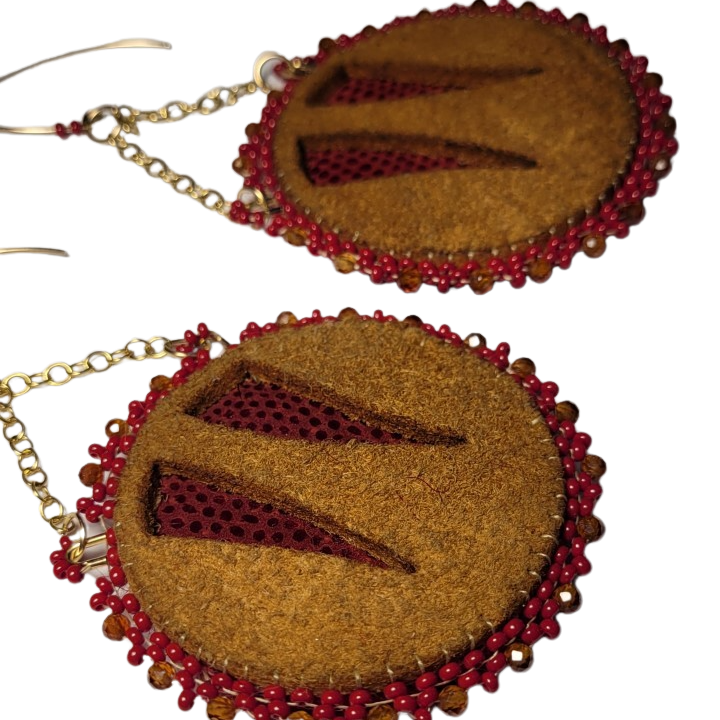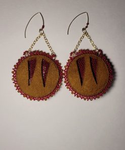 Laser cut sealskin and moosehide earrings are beautifully crafted with walrus tusk design and moosehide, red sealskin and glass bead, and Hessonite edging. Style a classic look with our 14K hooks