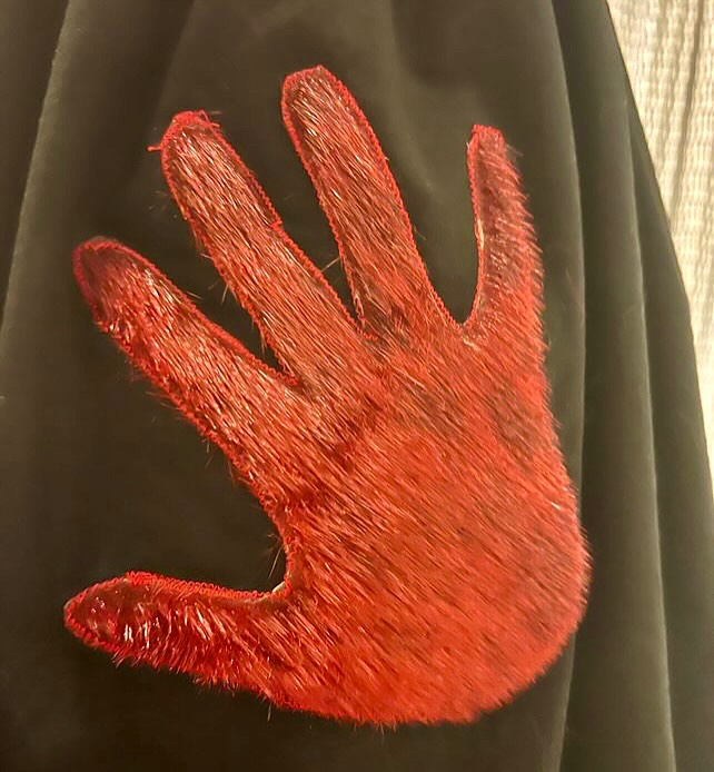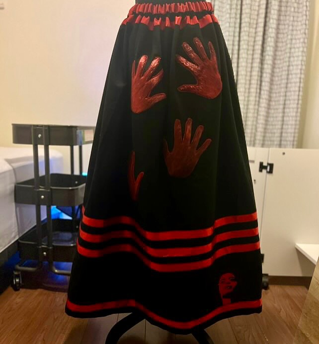 Katie’s MMIW ribbon skirt collab with @creaturecomfortcollective — featuring a red sealskin palm. It was displayed at IITC with @proudlyindigenouscrafts in February 2025, Montreal.