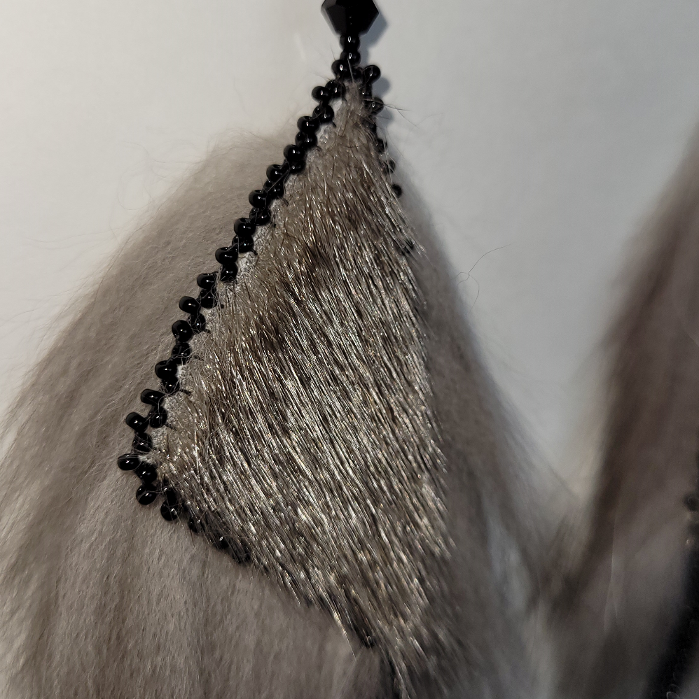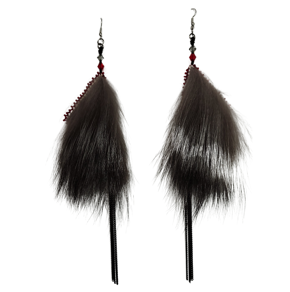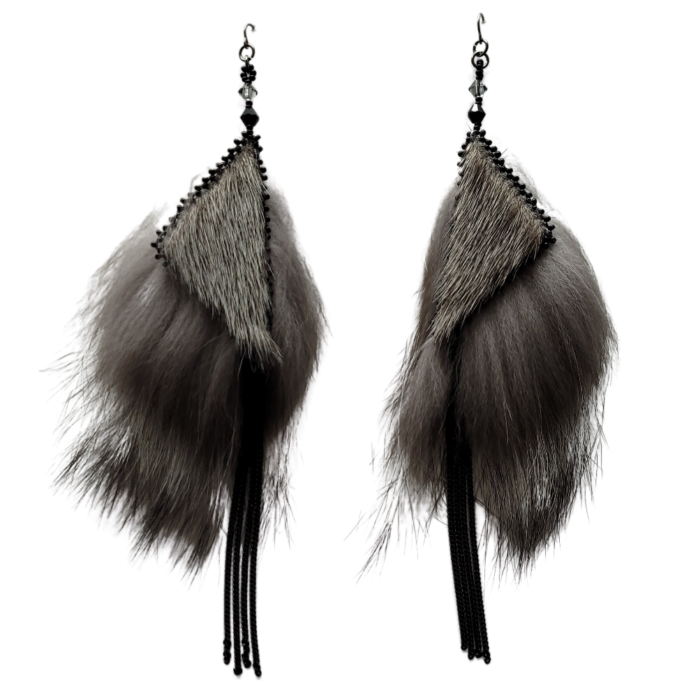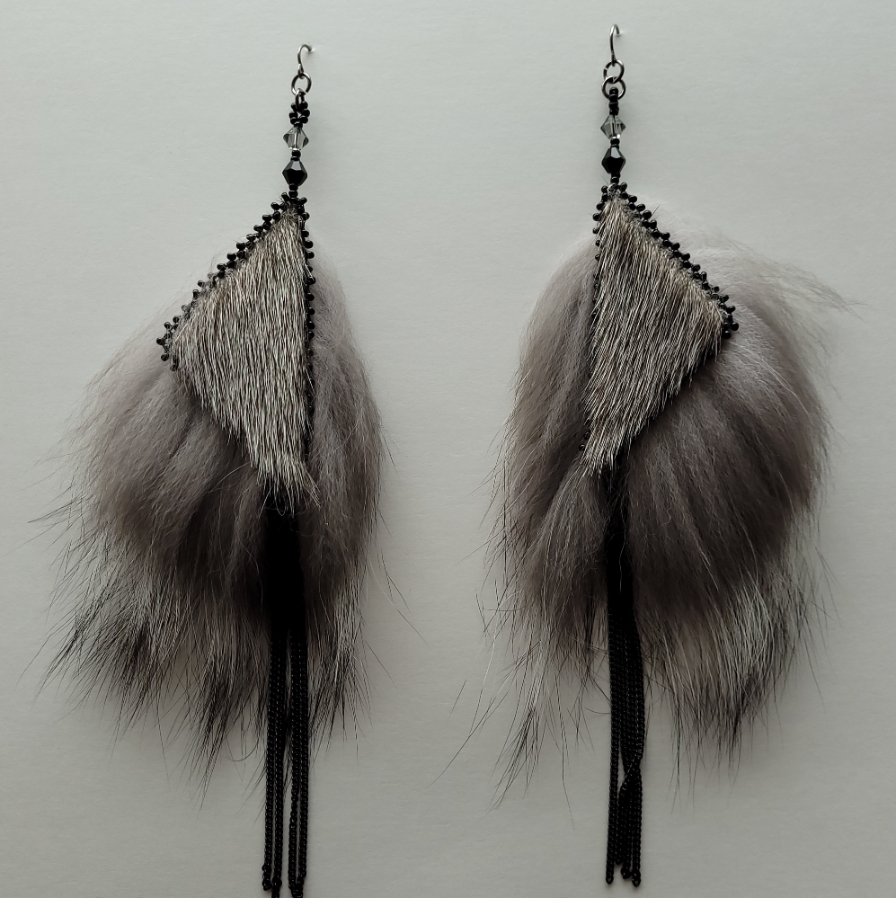 Hand crafted, Inuit made Sealskin earrings. Gorgeous natural sealskin triangle earrings, backed with Silver fox, edged in black beads, with black curb chain dangles. Perfect for a night out when you need that something extra, or a bold look for everyday use! A great conversation starter, they are beautiful, lightweight and sure to make a statement! A stunning combination of sealskin, fox fur and Swarovski shine.