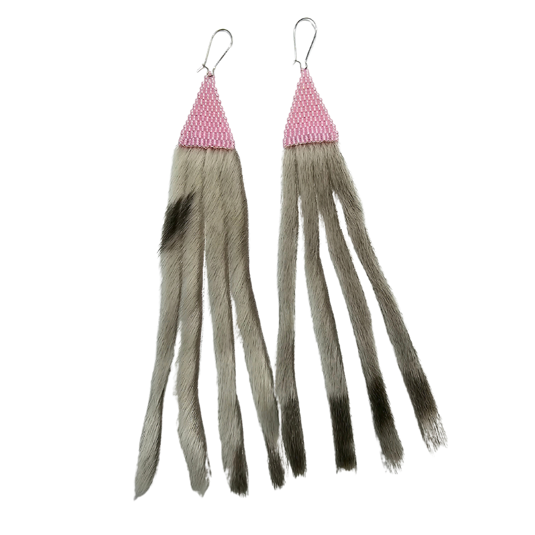 Crafted with meticulous detail, these lightweight pink beaded dangles with sealskin fringe feature vibrant pink beads and delicate sealskin fringe for a touch of luxury.