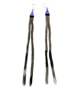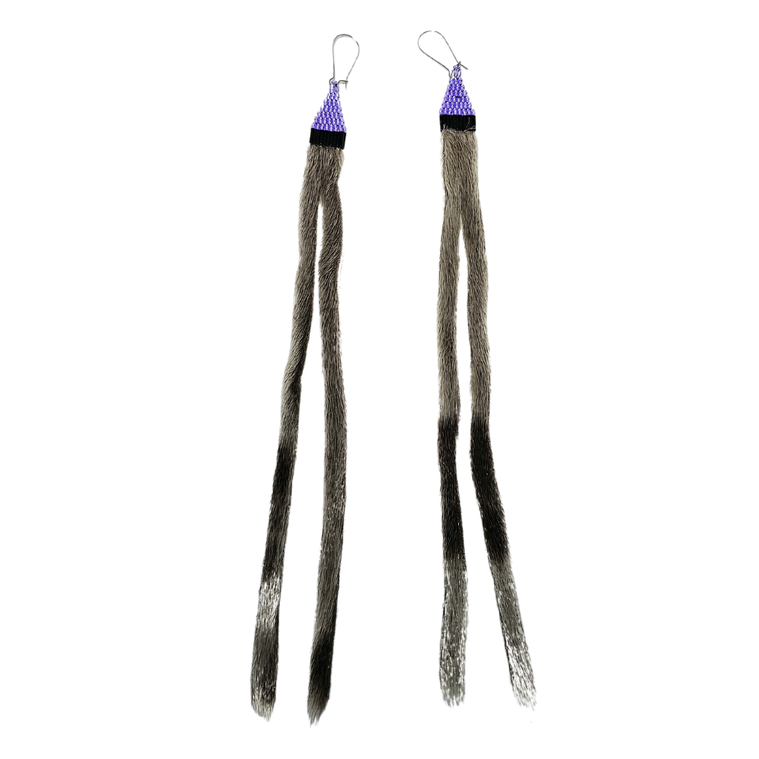 Introducing Bambi’s captivating Purple and Black Bead Dangles with Sealskin Fringe, measuring 9 inches. These exquisite dangles effortlessly combine sophistication and nature-inspired elements. Featuring a mesmerizing blend of purple and black beads, complemented by delicate sealskin fringe, they add a touch of luxury and intrigue to any ensemble.
