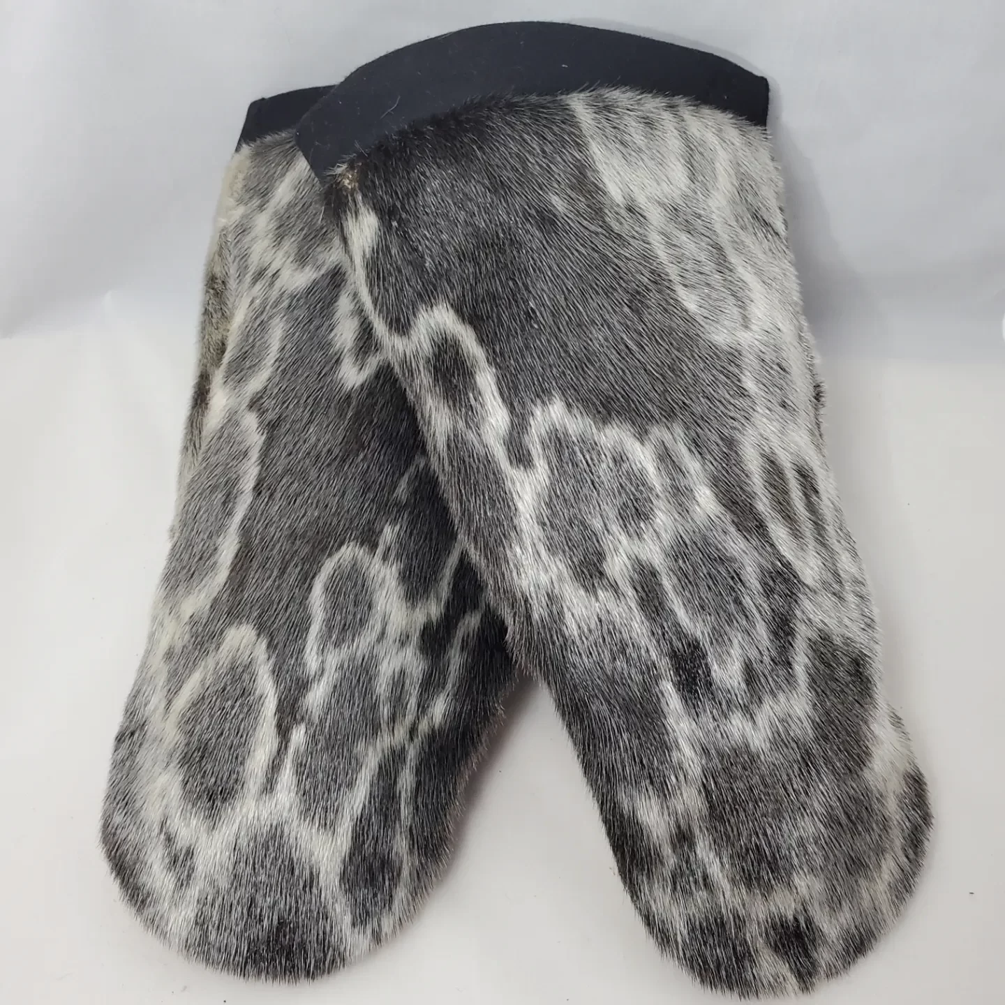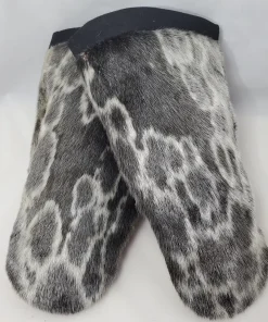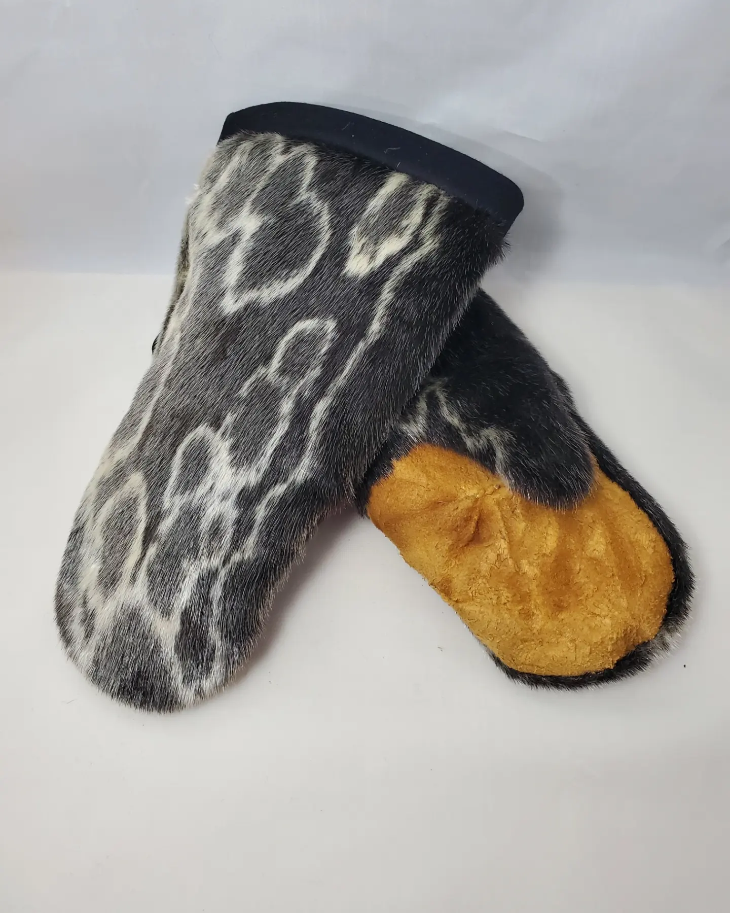 These sealskin mitts feature home-tanned moosehide palms, offering unparalleled softness and durability that is both comforting and practical. The natural beauty and texture of the moosehide lend an elegant touch to the design, while also providing a firm grip for any outdoor adventure.