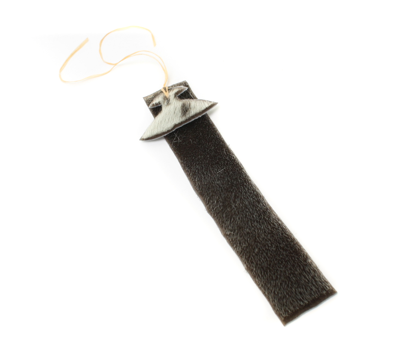 Handmade natural sealskin bookmark (100% ethically sourced). Sealskin ulu tied onto bookmark strip with sinew. For a simple, classic and unique gift for yourself or a friend. This bookmark promoted Split Tooth book by Tanya Tagaq