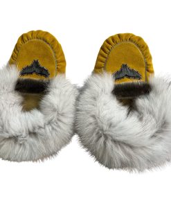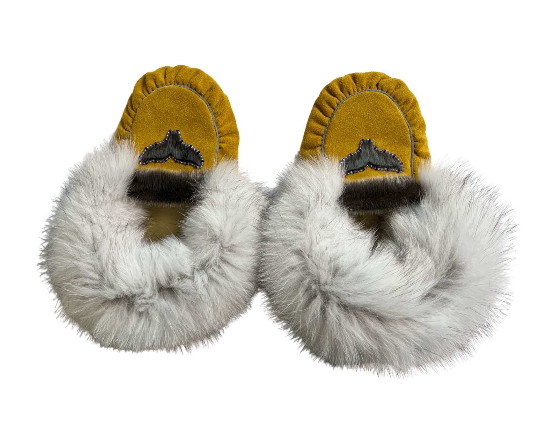 Discover the perfect blend of tradition and comfort with our Sealskin Whale Tail Slippers, featuring exquisite Chech bead detailing, premium sealskin, durable hide, sumptuous Sherpa lining, and a touch of elegance with blue fox fur.