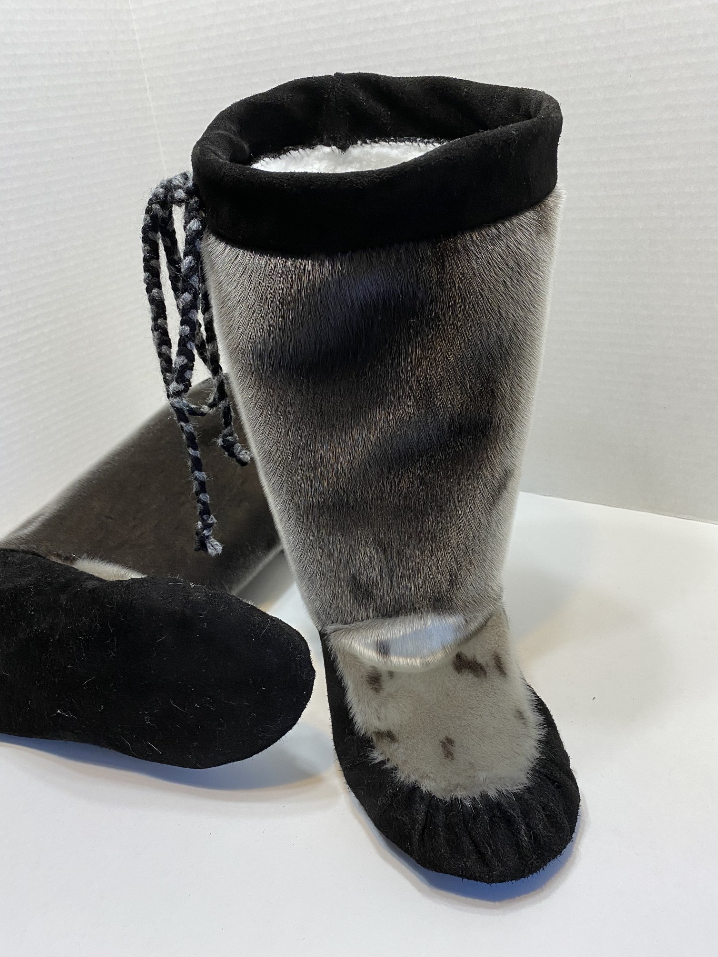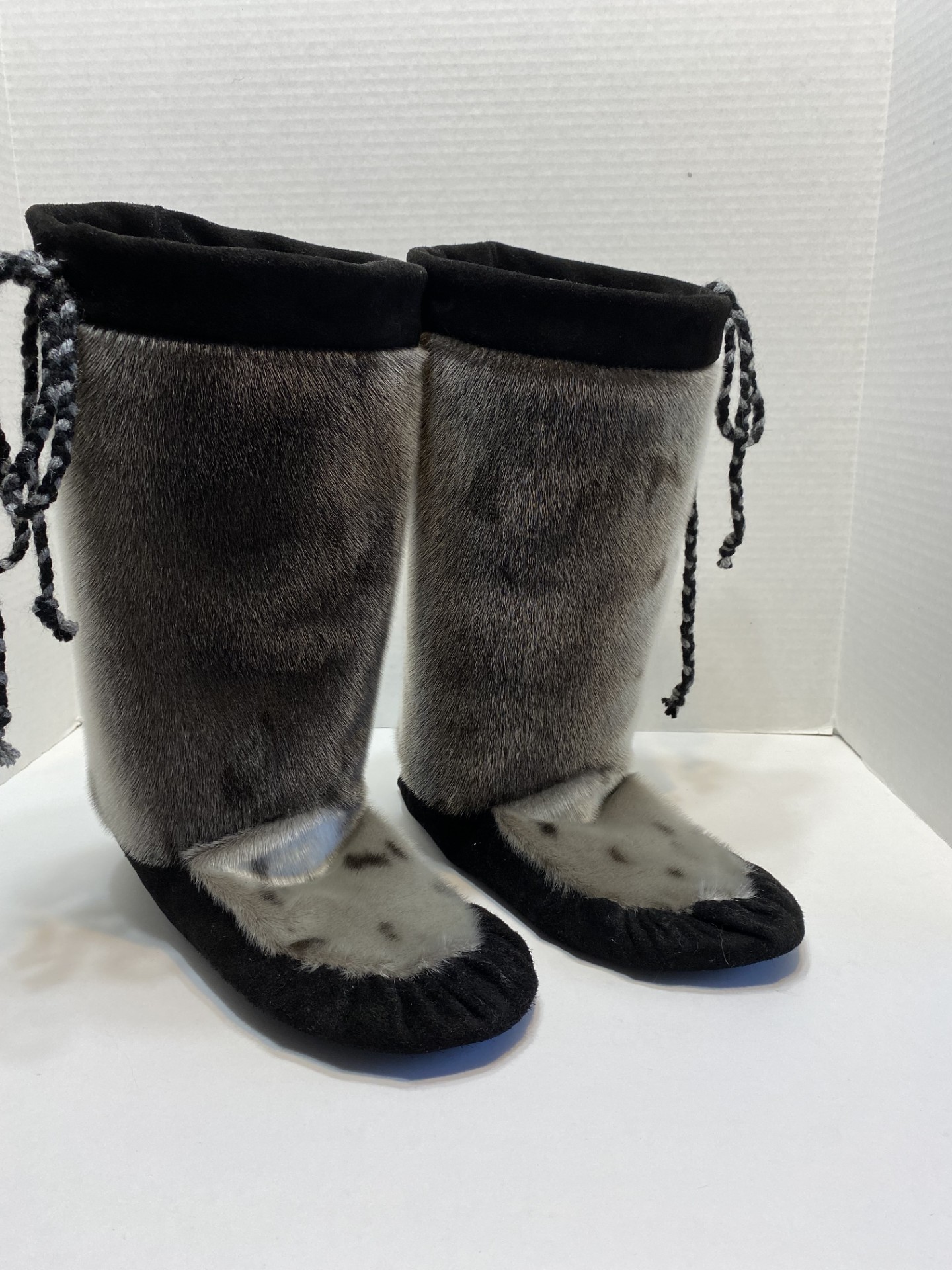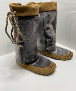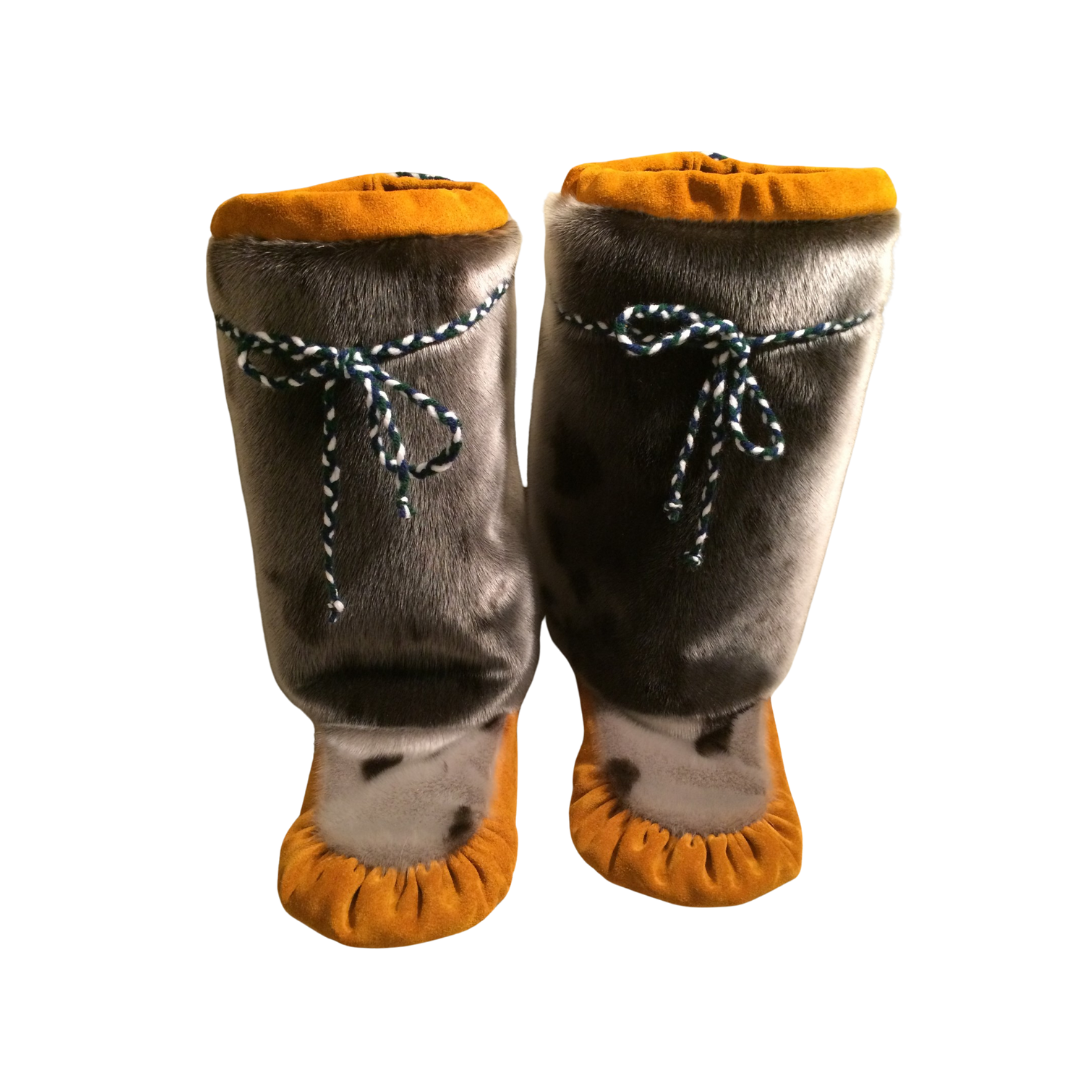 Unisex sealskin mukluks with moosehide, featuring a cozy pile high lining for added warmth, made to order in your choice of custom colors and sizes.