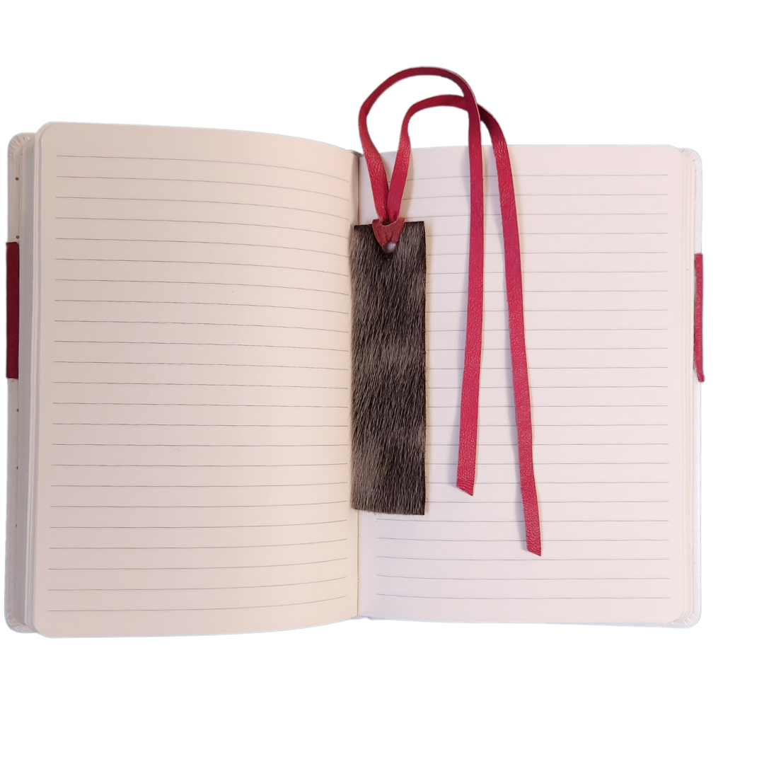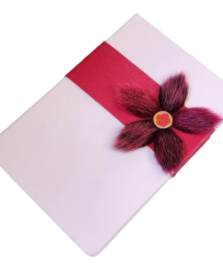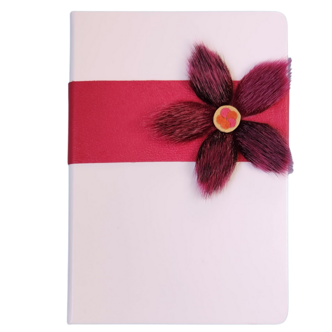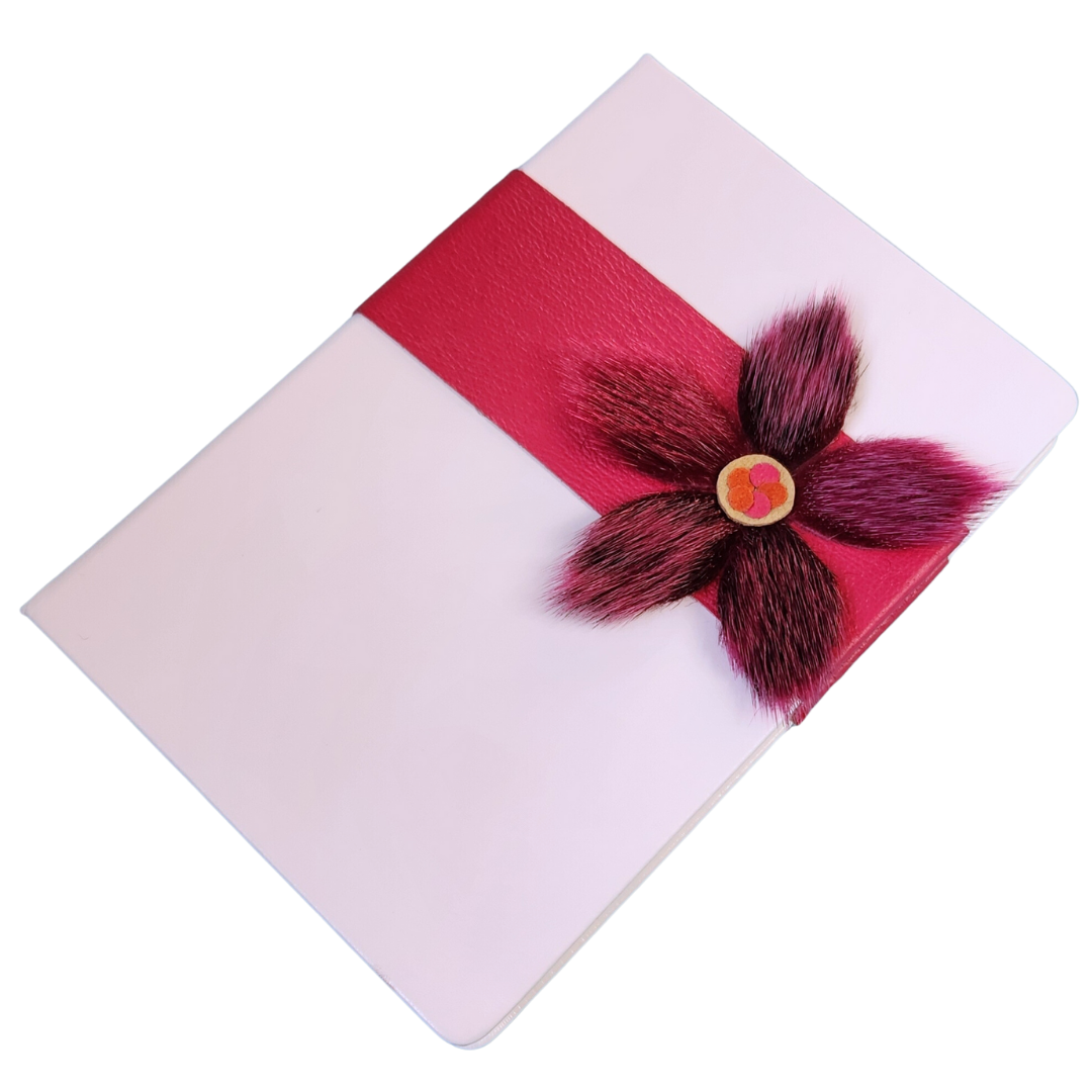 White leather commercial journal with 200 lined pages to inspire you to write your thoughts, goals and dreams. Embellished with authentic Inuit sealskin flower design plus a complimentary matching sealskin and leather bookmark. Beautiful, meaningful, luxury gift idea.