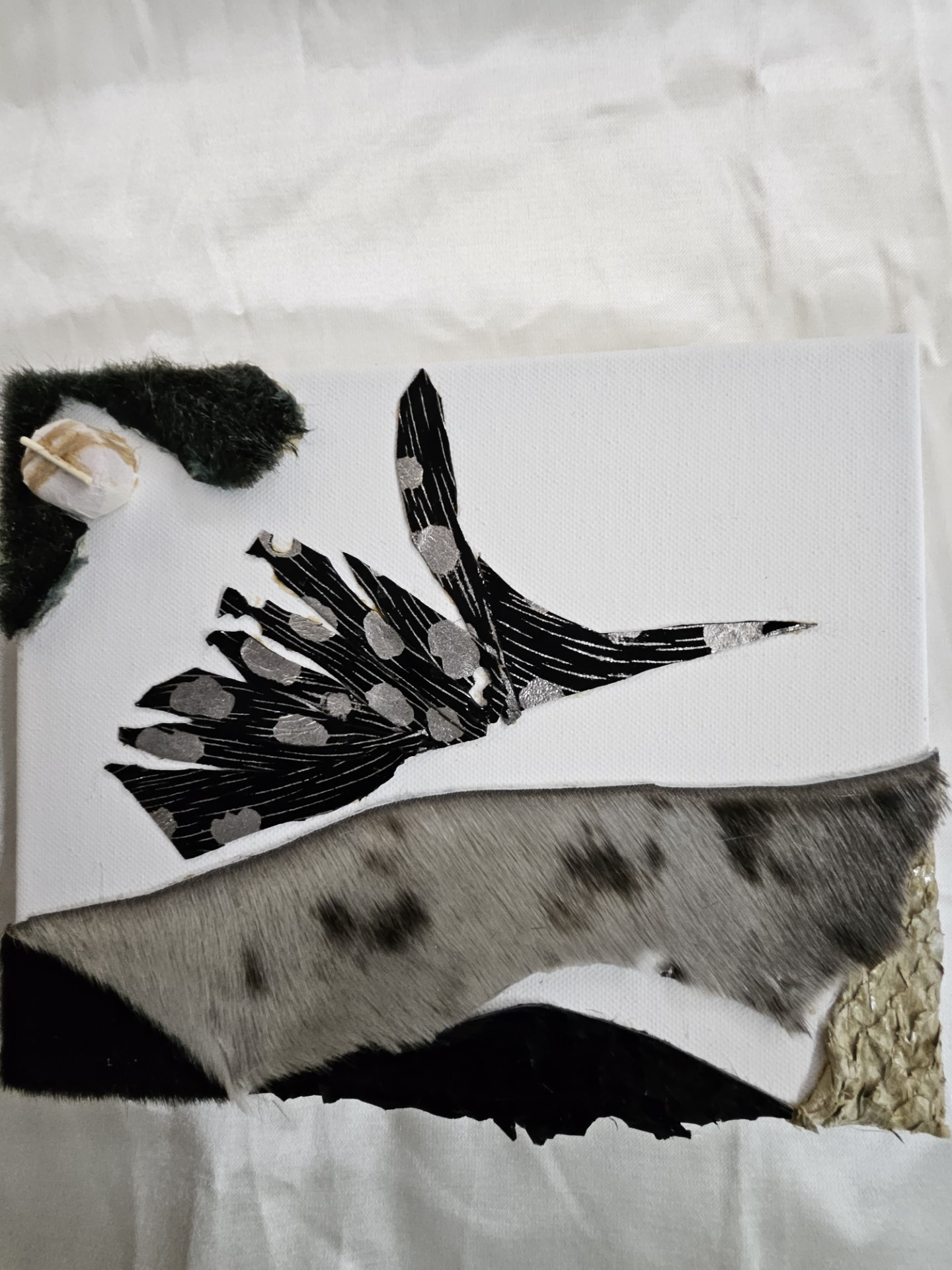 Admirez « Night Wing » (Aile de la nuit), une œuvre captivante mesurant 10 x 8 pouces. Fabriquée à partir de peau de phoque, de tendons, de peau de poisson, de bambou, de cuir métallisé et de papier blanchi sur la neige, cette œuvre abstraite s’envole loin des tourments terrestres. Observez l’envol de l’Aile de la nuit et immergez-vous dans sa beauté éthérée, évoquant un sentiment de mystère et de tranquillité. Embarquez pour un voyage vers une destination céleste inconnue à travers les détails complexes de cette création unique et envoûtante.